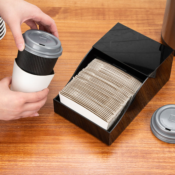 The horizontal cup sleeve dispensers have ample space for 50 coffee cup sleeves while the vertical one can hold up to 75 sleeves to help you organize your supplies and ensure there won’t be any clutter at your coffee bar. Each of these holders is compatible with any of our coffee cup sleeves.