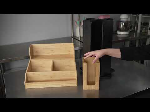Streamline beverage service with the Restpresso Black Revolving Bamboo Coffee Station Organizer. Designed with a tall and space-saving 9-inch by 18-inch structure, this coffee station organizer accommodates abundant coffee cups and lids, maximizing efficiency in busy cafés. Its revolving base ensures this revolving cup holder provides easy access from all angles, enabling fast and convenient retrieval of drinkware. Crafted from sustainable black bamboo, this countertop cup organizer enhances the aesthetic appeal of any service area with its modern charm. The four-section design keeps cups and lids organized, allowing seamless service at coffee stations. Ideal for coffee shops, office break rooms, or event catering services, this organizer keeps beverage areas tidy while saving valuable counter space, making it an indispensable tool for foodservice professionals. Each order includes 1 Restpresso Revolving Bamboo Coffee Station Organizer.