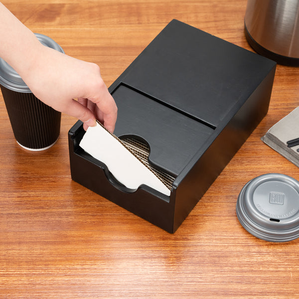 Add style and organization to your coffee supplies using our Restpresso Black Bamboo Coffee Cup Sleeve Holder. A perfect addition for cafes, restaurants, or hotels, this cup sleeve holder can fit up to 50 sleeves to provide a constant supply of coffee sleeves for customers. With a spring-loaded design and a wide opening at the front, this coffee cup sleeve holder provides an efficient way to quickly grab coffee sleeves and easily refill the dispenser. This bamboo coffee sleeve holder is chip-resistant and break-resistant to maintain its high-quality appearance for everyday use. The sleek black finish of this cup sleeve holder adds a stylish touch to self-serve coffee stations. Built with a sturdy base, this coffee cup sleeve holder provides superior stability on surfaces to provide guests an easy way to grab sleeves without making a mess. This coffee sleeve holder measures 9.5 inches in length by 6 inches in width and 3.75 inches in height. Shipped in a 1 count box.
