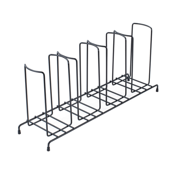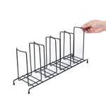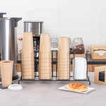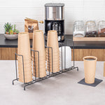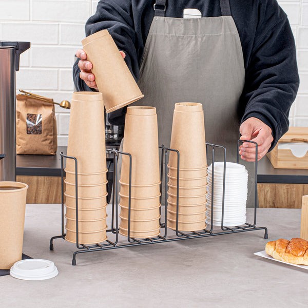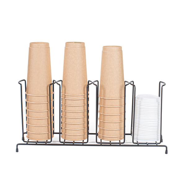 Enhance beverage station efficiency with a streamlined cup and lid display. The Restpresso Four-Section Space-Saving Cup and Lid Display combines four sections that organize cups and lids efficiently, reducing clutter and speeding up service. Crafted from durable black iron, this iron condiment holder withstands daily use in high-traffic foodservice settings, ensuring longevity and reliability. Its compact dimensions of 18.5 inches in length, 8.5 inches in width, and 5 inches in height allow it to fit neatly on countertops, maximizing space without sacrificing functionality. The sleek black finish of this wire cup and lid caddy adds a modern, professional aesthetic to any beverage station, enhancing overall presentation. Perfect for coffee shops and self-service stations, it offers quick access to drinkware, improving workflow. Streamline operations with this versatile cup and lid display. Each order includes 1 Restpresso Four-Section Space-Saving Cup and Lid Display.