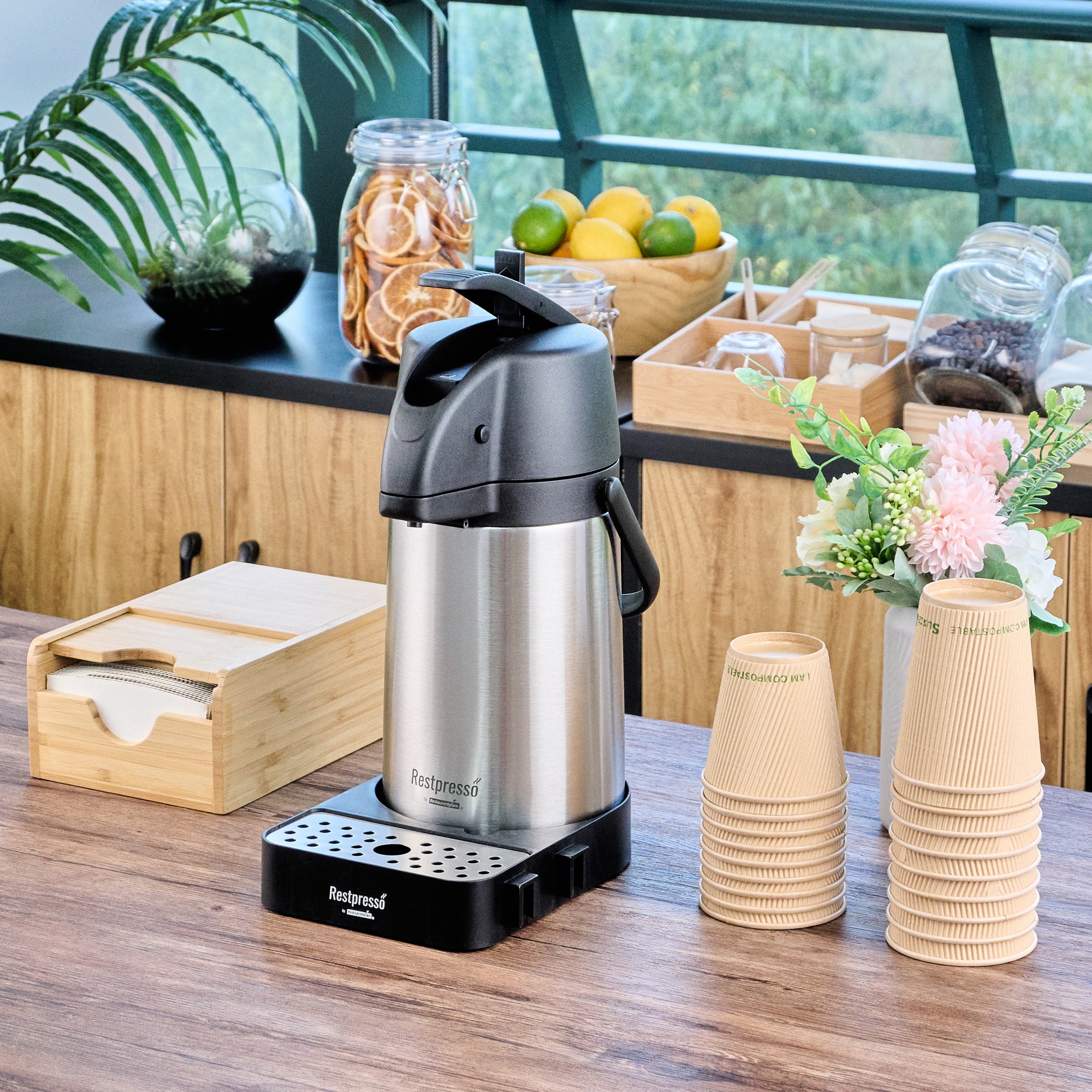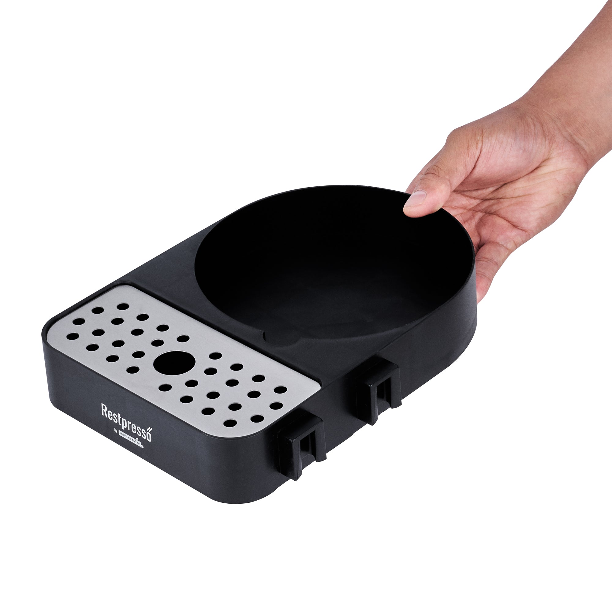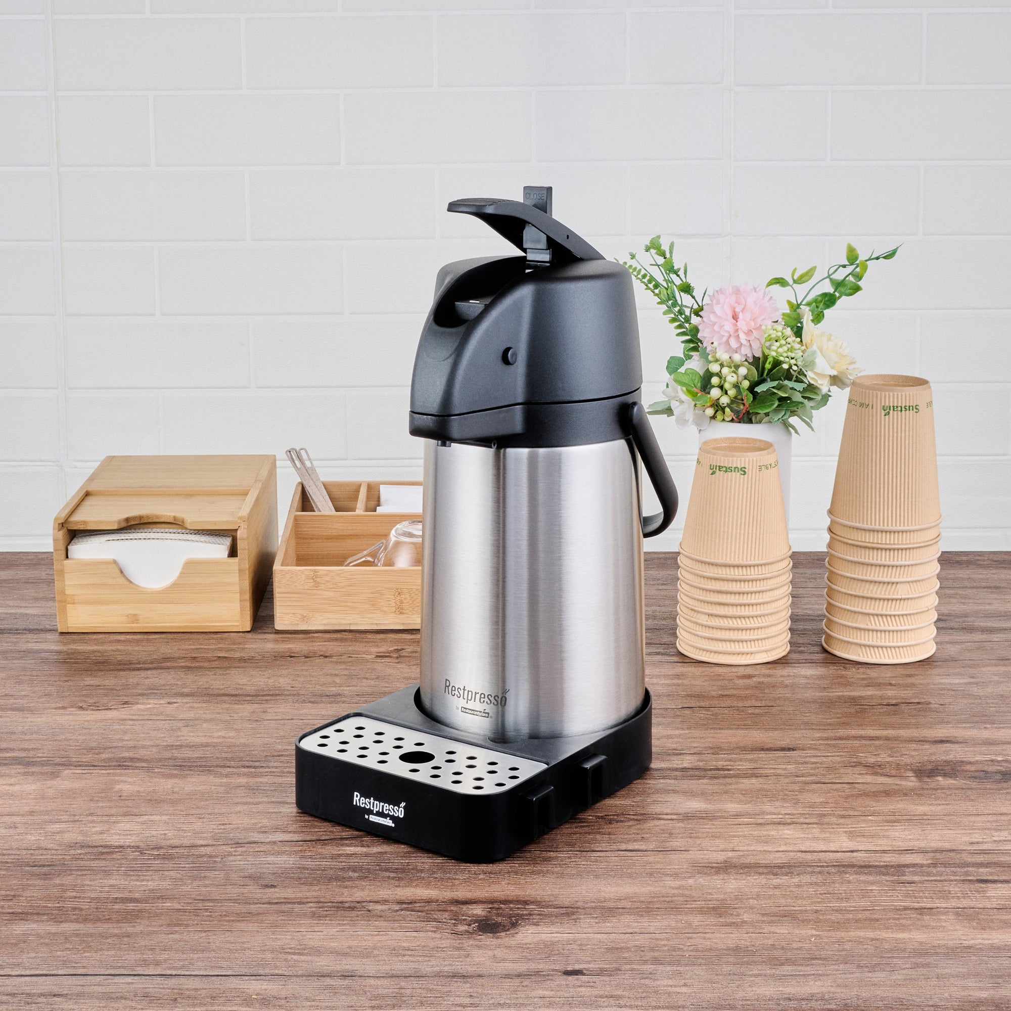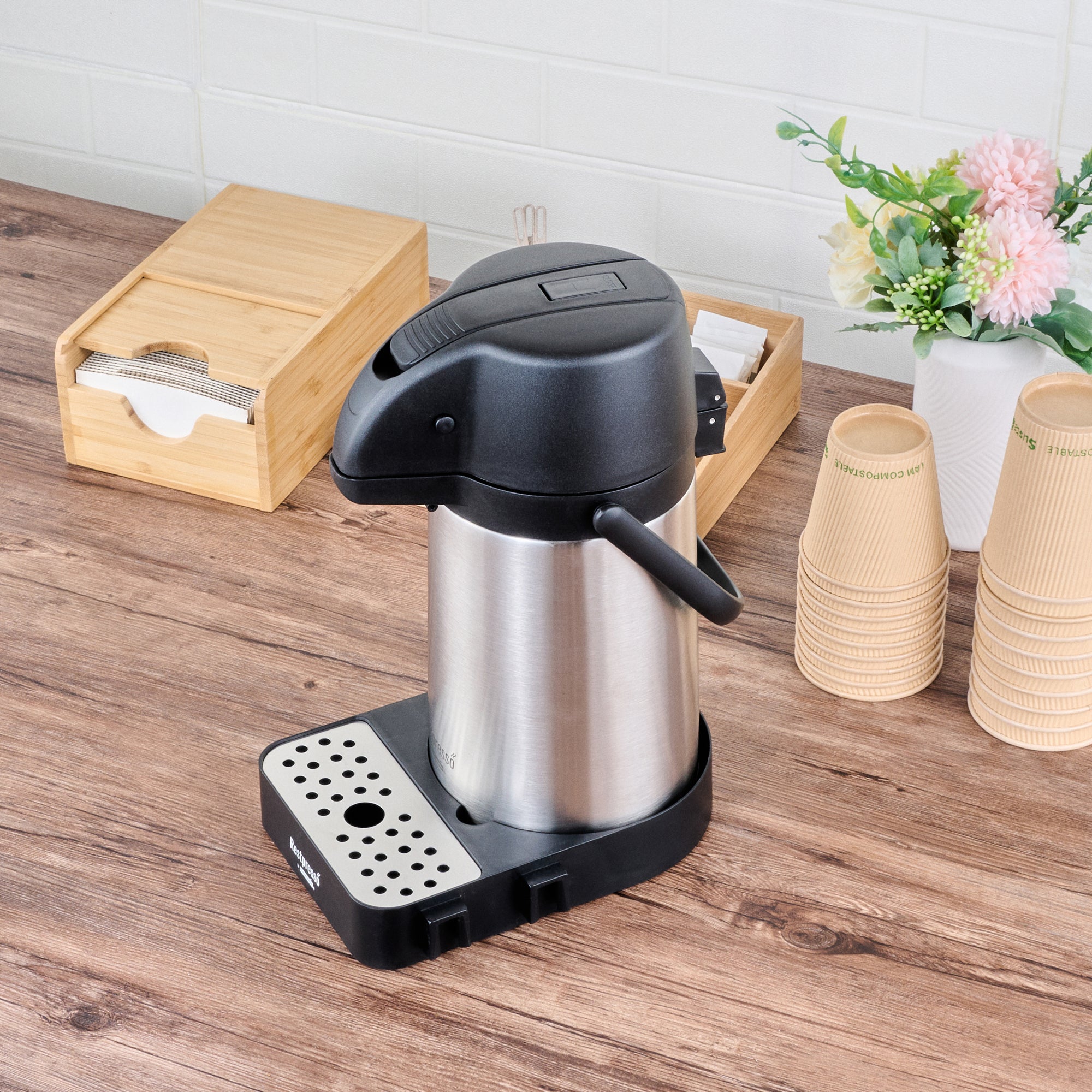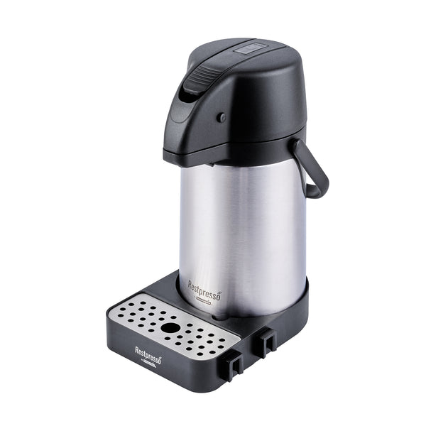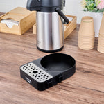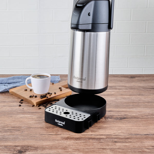 Optimize your beverage setup with a versatile airpot holder. The Restpresso Modular Stainless Steel Airpot Holder features a modular design that connects trays to create customizable coffee stations, accommodating various service setups seamlessly. Its durable construction ensures it withstands daily foodservice demands, making it an ideal choice for busy environments. An integrated stainless steel drip tray maintains a clean serving area by catching spills, reducing cleanup time, and enhancing operational efficiency. Measuring 9.6 inches long, 7.3 inches wide, and 2 inches high, this sleek black airpot holder maximizes counter space with its compact footprint, perfect for high-traffic coffee station racks. Elevate your beverage service setup effortlessly with this dependable airpot holder. Each order includes 1 Restpresso Modular Stainless Steel Airpot Holder.