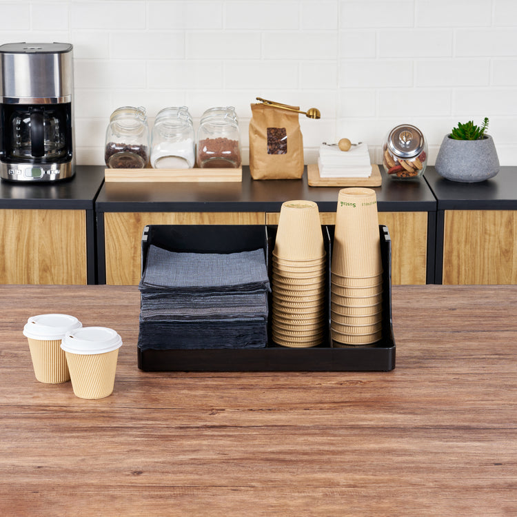 BLACK PLASTIC COFFEE CUP / LID / NAPKIN ORGANIZER - 3 SECTION
