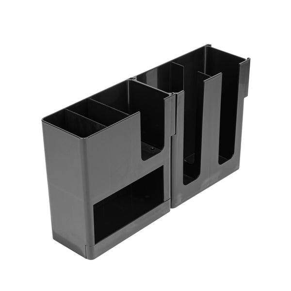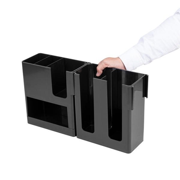 Elevate your beverage service with our Restpresso Black Plastic Coffee Cup / Lid / Napkin Organizer, the ultimate solution for efficient and stylish countertop organization. This coffee organizer features 6 spacious compartments, ensuring coffee cups, lids, napkins, and more are neatly arranged and within easy reach. Designed with an open layout, these organizers allow staff to quickly assess supply levels, preventing any shortages during busy hours. Crafted from premium plastic, this coffee caddy promises durability and long-lasting use, making it a dependable addition to your setup. With its compact design, this plastic organizer seamlessly fits into any space, maximizing efficiency without overwhelming your countertop. The sleek black finish of this countertop organizer adds a touch of sophistication to any coffee station, enhancing the overall aesthetic appeal. Measuring 17.32 inches in length by 4.33 inches in width by 9.65 inches in height, this organizer boasts a perfect size for versatile placements. Sold in a 1 count box.