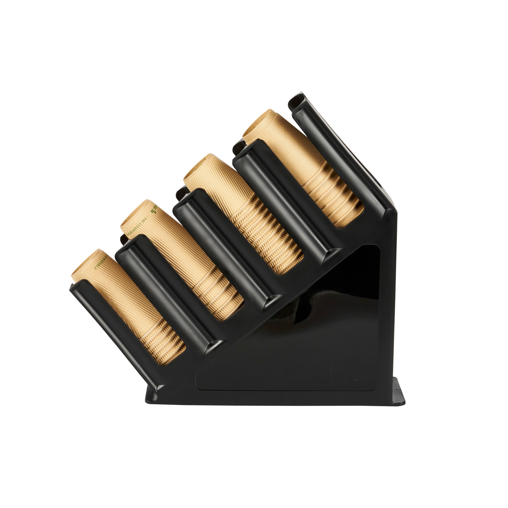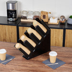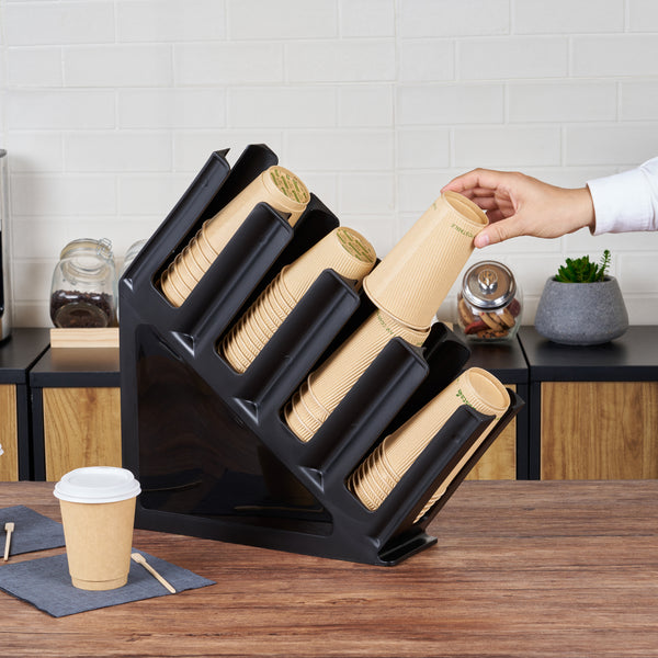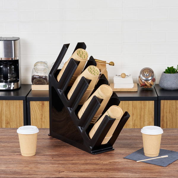 Optimize your coffee station with our Restpresso Black Plastic Coffee Cup / Lid Organizer. This coffee organizer features 4 compartments, perfect for keeping lids, and coffee cups neatly arranged and easily accessible. The open design of this plastic organizer lets staff easily monitor supply levels at a glance, ensuring you do not run out of beverage supplies during peak hours. Crafted from premium plastic, this coffee caddy is designed for long-lasting use, providing reliable storage for your beverage supplies. With a compact design, this black organizer fits seamlessly into any space, maximizing efficiency without taking up too much room. The black finish of this organizer adds a touch of sophistication while complementing any coffee station setup. Measuring 18.62 inches in length by 4.53 inches in width by 17.91 inches in height, this countertop organizer is both stylish and functional. Sold in a 1 count box.
