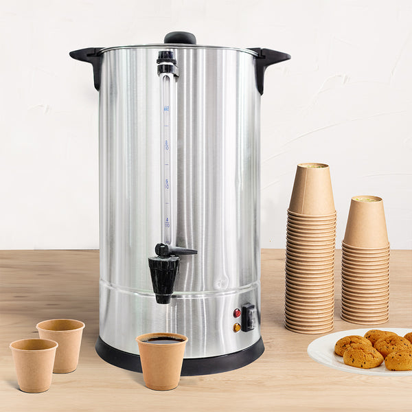 Serve more guests with ease using a large capacity coffee urn. The Restpresso High Capacity Stainless Steel Coffee Urn boasts a robust stainless steel construction, ensuring durability and longevity, making it perfect for high-volume commercial settings. With a generous 55-cup capacity, this urn minimizes the need for frequent refills, ideal for catering large events or self-serve stations. Its user-friendly dispensing spout streamlines service, acting as a reliable coffee dispenser that enhances customer satisfaction. This urn features a water gauge for easy monitoring, ensuring timely refills, and its dimensions of 8.66 inches by 8.66 inches by 17.32 inches make it a compact yet powerful addition to any beverage service. Elevate your coffee service with this stainless steel coffee urn, combining efficiency and safety. Each order includes 1 Restpresso High Capacity Stainless Steel Coffee Urn.
