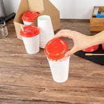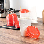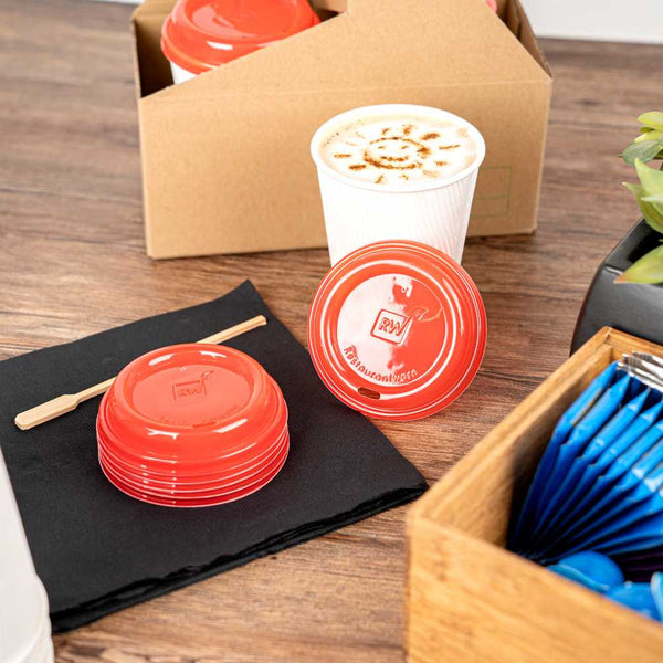 Elevate your coffee experience with our Restpresso Glossy Red Plastic Coffee Cup Lids. Made from premium plastic, these coffee cup lids are built to last, ensuring durability when sipping on hot or cold drinks. These disposable coffee lids are compatible with our 8-ounce, 12-Ounce, 16-Ounce, and 20-Ounce paper cups (SKUs: RWA1129K, RWA0275K, RWA0276W, RWA0779R), guaranteeing fewer spills and leaks during hurried mornings or on-the-go rush, keeping beverages secure and attire spotless. Equipped with an elevated spout, these lids for cups offer the added advantage of a smooth and controlled pour. These plastic hot lids boast a ventilated design that enables an even cooling process for hot beverages. The vibrant red finish of these plastic lids adds a touch of flair, infusing a modern twist to coffee service while upholding exceptional functionality. To reduce cleanup efforts, these glossy red plastic lids can be tossed after use. Measuring 3.5 inches in diameter and 0.75 inches in height, these lids fit most standard-sized coffee cups. Sold in a 25 count box. Coffee cups and lids are sold separately.