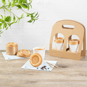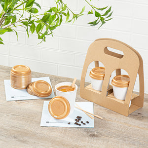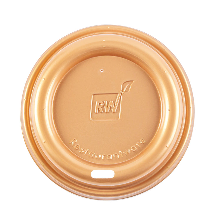 Enhance your coffee service with our Restpresso Gold Plastic Coffee Cup Lids. These plastic lids can be paired with our collection of compatible Restpresso 8-ounce, 12-ounce, 16-ounce, and 20-ounce paper coffee cups to form a tight seal and prevent spills while taking coffee on-the-go. Made from plastic, these disposable lids boast premium durability and sturdiness. With a built-in ventilation hole, these disposable coffee cup lids improve airflow so guests can smoothly sip their beverages. Designed with an elevated rim, these hot cup lids provide an uninterrupted flow of hot or cold drinks for an elevated sipping experience. The elegant gold finish of these cup lids enhances the look of to go orders, giving them a stylish appeal. To provide an efficient cleaning experience, these to go cup lids can be tossed after use. Ideal for cafes and restaurants looking for eco-friendly cafe supplies, these round lids are recyclable. Measuring 3.62 inches in length by 3.62 inches in width by 0.79 inches in height, these gold plastic lids are the perfect fit for your needs. Sold in a 25 count box. Cups are available and sold separately.