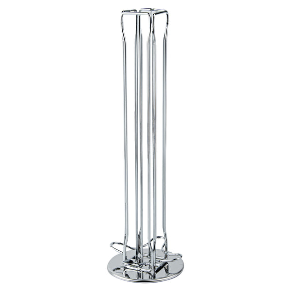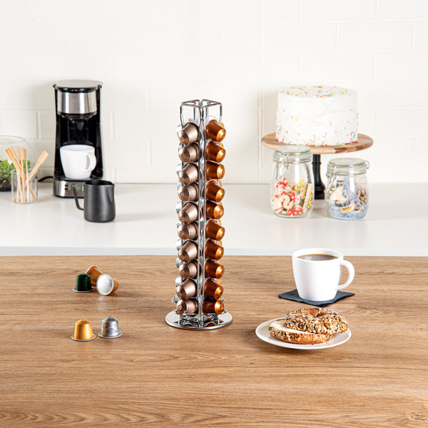 Optimize your coffee service with a sleek, space-saving solution. The Restpresso High Capacity Revolving Coffee Pod Holder elegantly displays and organizes up to 40 coffee pods, ensuring your café or restaurant maintains an efficient flow even during peak hours. This cleverly designed coffee pod holder features a 360-degree revolving base, allowing staff and customers to quickly access their favorite brew without hassle. With a compact footprint of 4.53 inches by 4.53 inches and a height of 14.57 inches, this Nespresso capsule holder is perfect for maximizing countertop space, making it an ideal choice for establishments with limited room. Constructed from durable iron, this coffee pod dispenser withstands the demands of daily commercial use, while its silver finish adds a touch of modern elegance to any coffee station. Elevate your service and streamline your operations with this essential coffee accessory. Each order includes 1 Restpresso High Capacity Revolving Coffee Pod Holder.