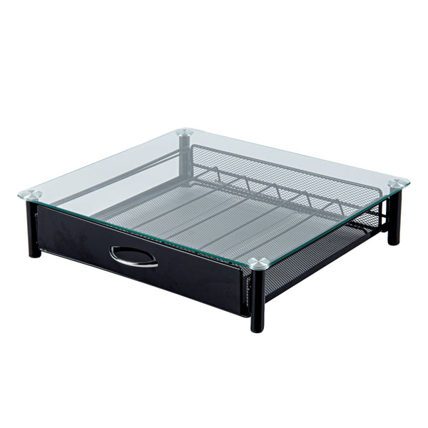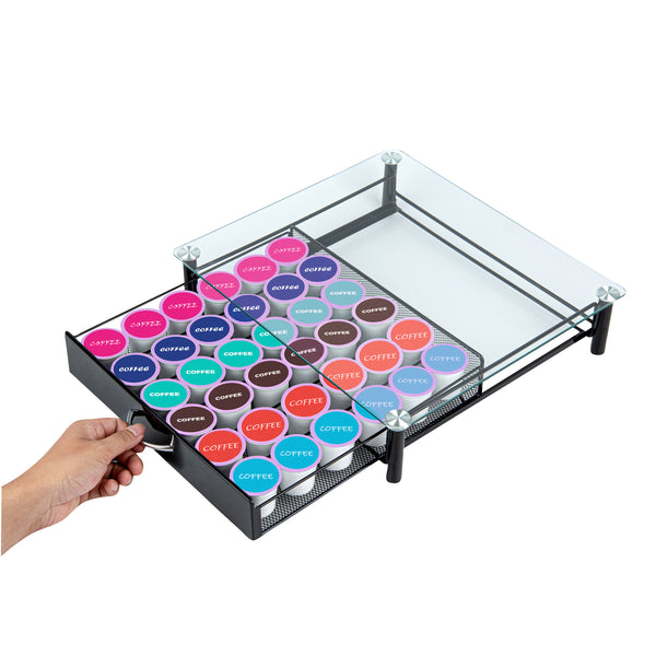 - Tempered glass drawer stores 36 K-cups efficiently