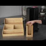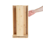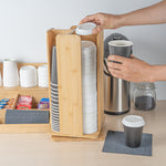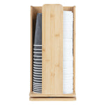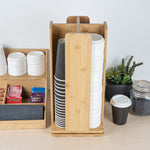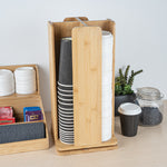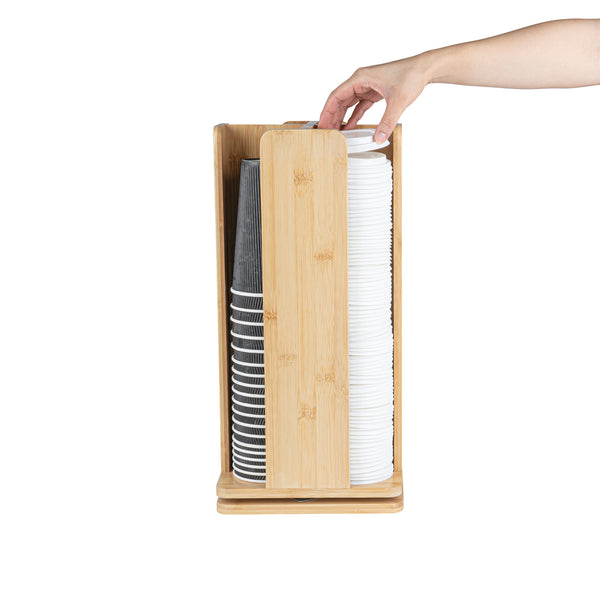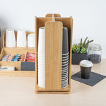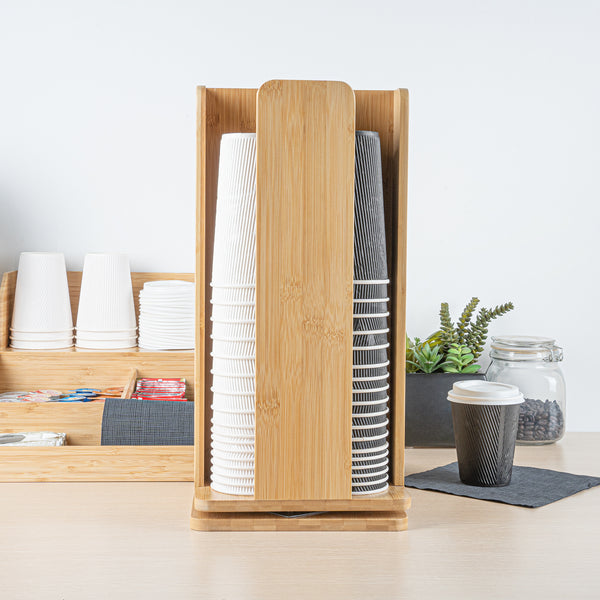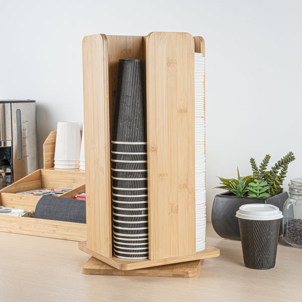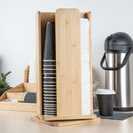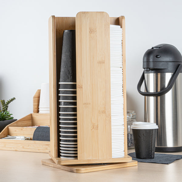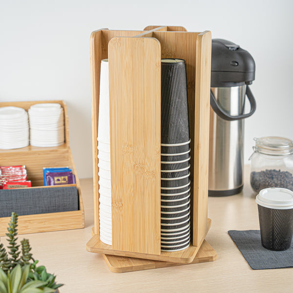 Enhance your coffee station's efficiency with a revolving design. The Restpresso Revolving Access 4-Compartment Bamboo Coffee Cup Organizer provides easy access to cups and lids from all angles, optimizing service in high-traffic areas. Crafted from bamboo, this organizer offers a durable solution that complements sustainable initiatives while adding aesthetics. With its compact dimensions of 9 inches by 9 inches by 18 inches, it fits comfortably on countertops, making it ideal for establishments with limited space. The multi-compartment cup organizer features four sections to efficiently store various cup and lid sizes. The wide base provides stability for stacked items, preventing toppling. Perfect for coffee shops, hotel buffets, and office break rooms, this bamboo coffee cup organizer ensures a tidy and professional beverage station. Each order includes 1 Restpresso Revolving Access 4-Compartment Bamboo Coffee Cup Organizer.