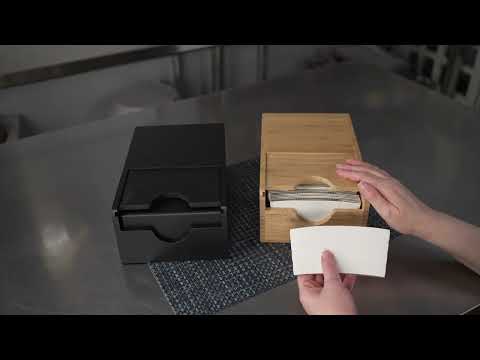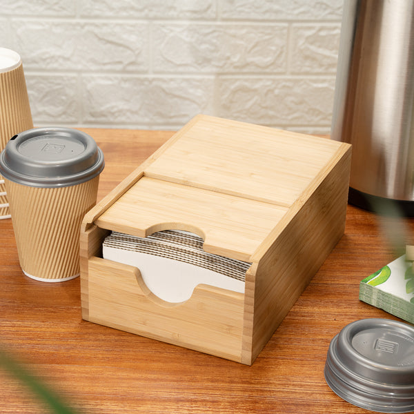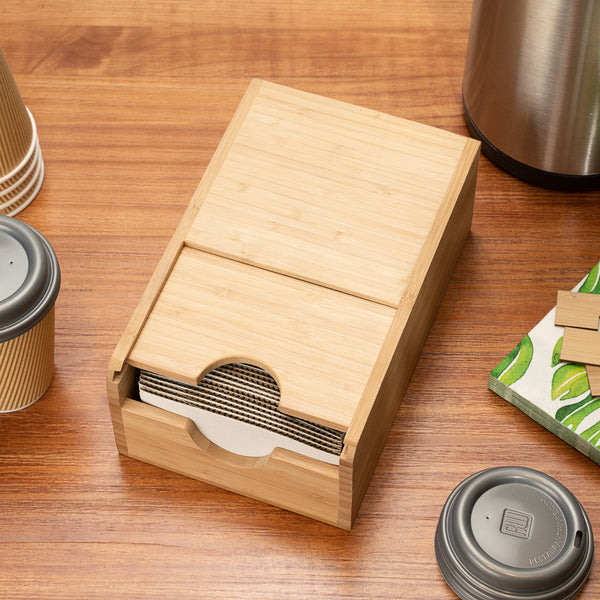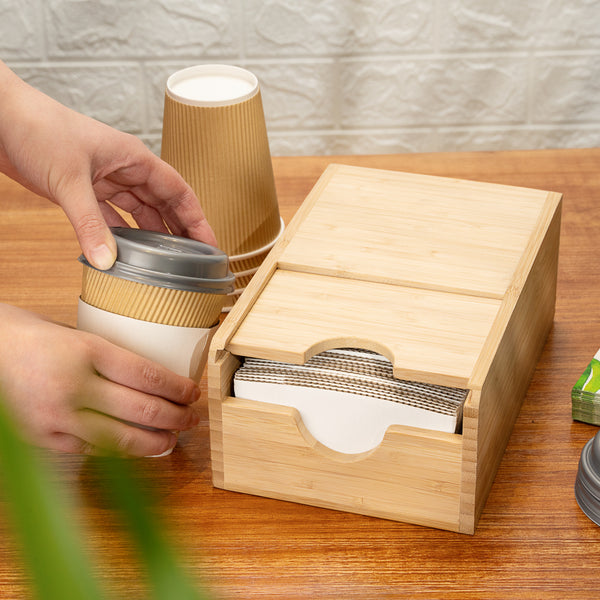 Keep your self-serve coffee stations neatly organized with our Restpresso Natural Bamboo Coffee Cup Sleeve Holder. With a spring-loaded design and wide opening at the front, this coffee sleeve holder pushes sleeves to the front of the dispenser to make them easily accessible for customers. Plus, it provides staff members with a quick and efficient way to refill the dispenser. This cup sleeve dispenser conveniently holds up to 50 coffee sleeves, providing a constant supply for patrons at your busy cafeteria, coffee shop, or convenience store. Constructed from eco-friendly bamboo, this sleeve holder has a natural finish that complements the look of your coffee supplies while adding a rustic touch to coffee stations. Measuring 9.5 inches long by 6 inches wide by 3.75 inches tall, this coffee cup sleeve holder features a compact design that saves counter space at your foodservice establishment. Shipped in a 1 count box.
