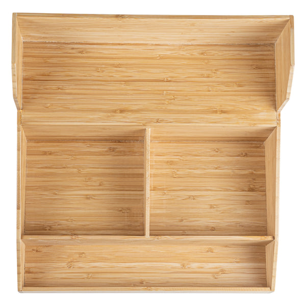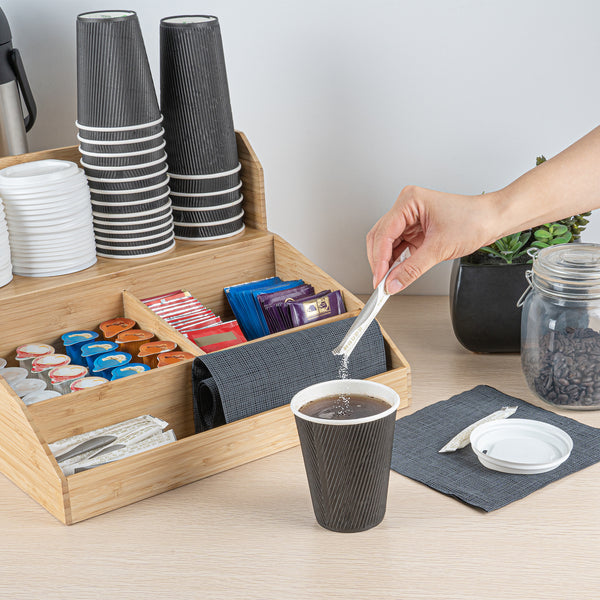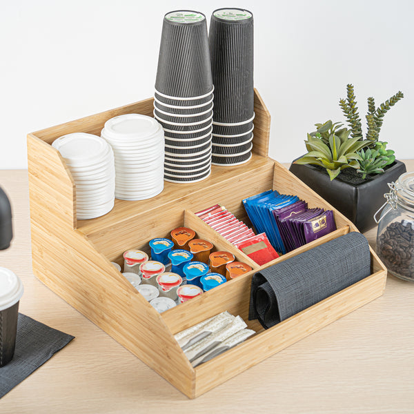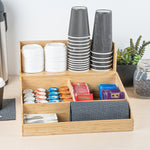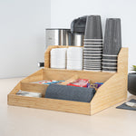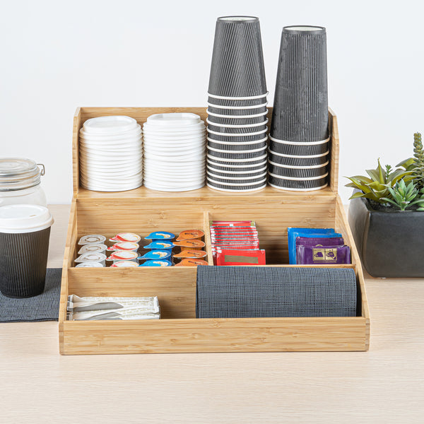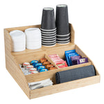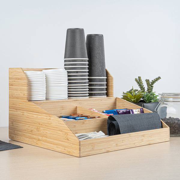 Enhance your beverage service with efficient organization solutions. The Restpresso Multi-Compartment Bamboo Condiment Organizer offers a spacious 15 inches by 14.25 inches by 9.25 inches design, perfect for accommodating coffee station essentials. Crafted from bamboo, this coffee station organizer provides a durable solution that effortlessly complements any countertop with its wood-grain finish. Its sturdy build ensures long-lasting use in busy cafes or hotel buffets. Featuring multiple compartments, this coffee cup organizer maximizes accessibility, allowing staff and guests to quickly grab what they need, thereby speeding up grab-and-go service. Lightweight and scratch-resistant, this organizer is ideal for easy repositioning and maintenance. Elevate your organization with this bamboo condiment organizer for a streamlined, professional presentation. Each order includes 1 Restpresso Multi-Compartment Bamboo Condiment Organizer.