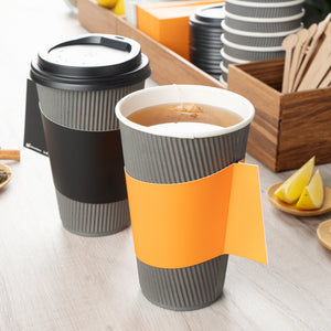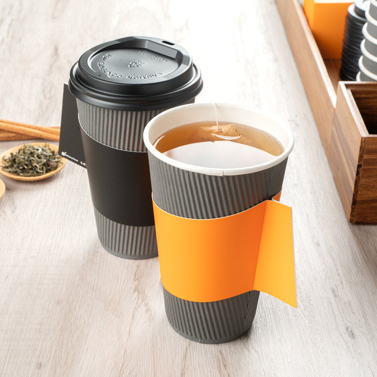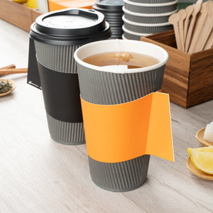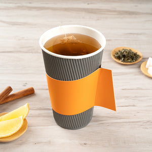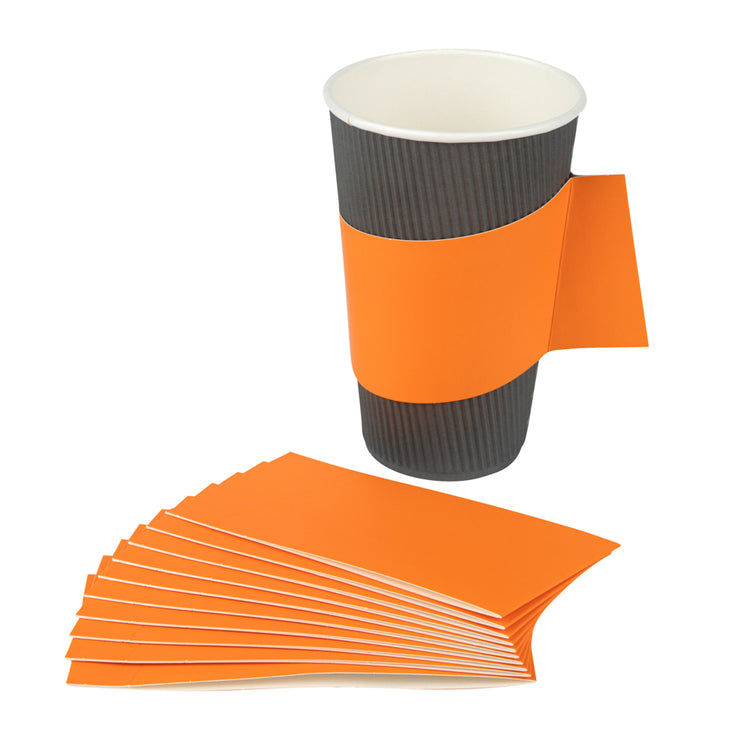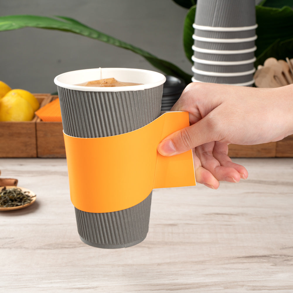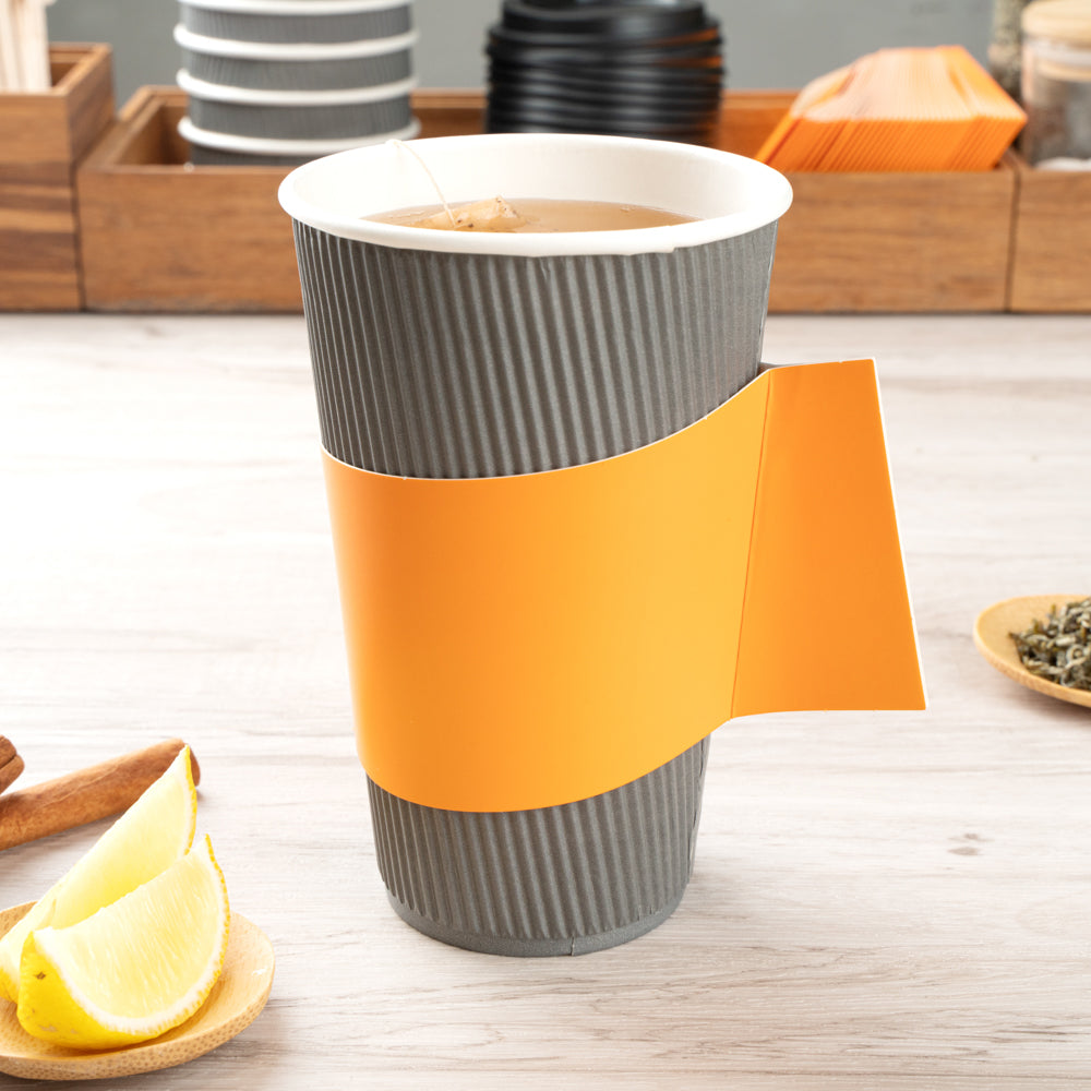 Ensure customer comfort with the Restpresso Orange Paper Coffee Cup Holder, featuring an integrated handle design that provides a secure grip, reducing spills and enhancing customer satisfaction. Made from insulating paper, this disposable coffee sleeve shields hands from hot beverages, ensuring a safe and enjoyable drinking experience. Its vibrant orange color not only adds a lively touch to your coffee service but also improves brand visibility. Designed to fit 12 to 20-ounce cups, this hot beverage sleeve offers versatile use across various drink sizes, making it ideal for coffee shops and catering events alike. Perfect for busy beverage operations, this paper coffee cup holder is a reliable choice. Each order includes 1000 Restpresso Orange Paper Coffee Cup Holders, 11.25 inches by 2.5 inches by 2.5 inches.