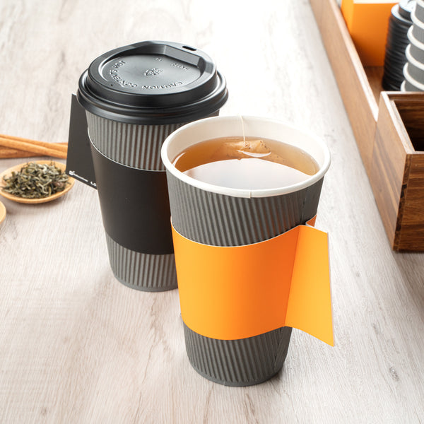 Ensure customer comfort with the Restpresso Orange Paper Coffee Cup Holder, featuring an integrated handle design that provides a secure grip, reducing spills and enhancing customer satisfaction. Made from insulating paper, this disposable coffee sleeve shields hands from hot beverages, ensuring a safe and enjoyable drinking experience. Its vibrant orange color not only adds a lively touch to your coffee service but also improves brand visibility. Designed to fit 12 to 20-ounce cups, this hot beverage sleeve offers versatile use across various drink sizes, making it ideal for coffee shops and catering events alike. Perfect for busy beverage operations, this paper coffee cup holder is a reliable choice. Each order includes 50 Restpresso Orange Paper Coffee Cup Holders, 11.25 inches by 2.5 inches by 2.5 inches.