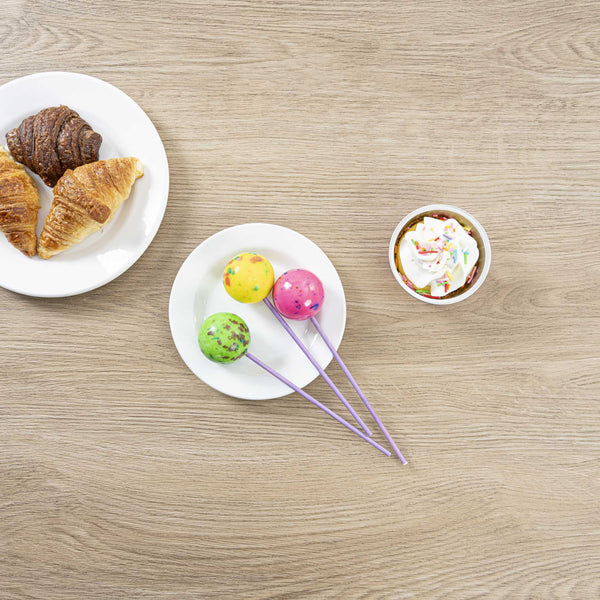 Enjoy sweet and savory bites with our Restpresso Purple Paper Cake Pop and Lollipop Sticks. Made from food-safe paper, these purple cake pop sticks are biodegradable and commercially compostable to provide an eco-friendly option for presenting small appetizers or desserts. These lollipop sticks are sturdy and can easily hold up the weight of your mini treats. Ideal for displaying red velvet cake pops or chocolate covered strawberries, these biodegradable lollipop sticks are the mess-free solution for serving bite-sized treats to customers. With vivid purple coloring, these paper cake sticks bring a colorful touch to any event, enhancing the colors of your desserts. These paper sticks measure 6 inches in length and are a mess-free solution for serving bite-sized treats to your customers. Shipped in a 25 count box. This item will only degrade outside of the traditional solid waste stream.