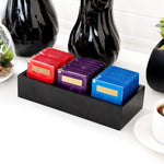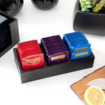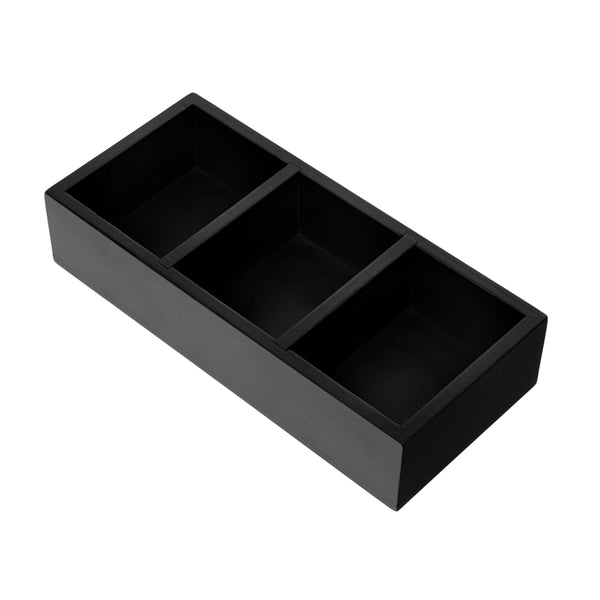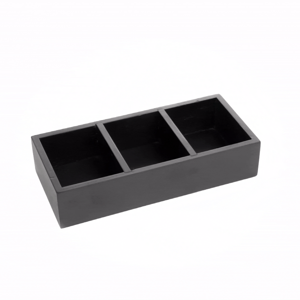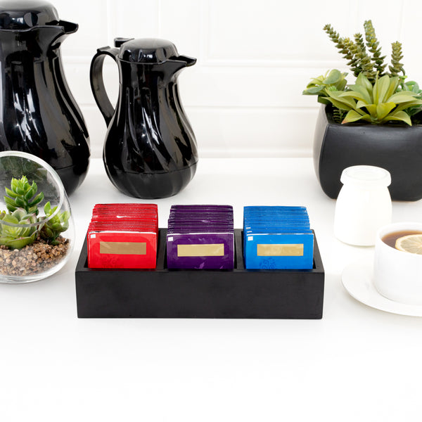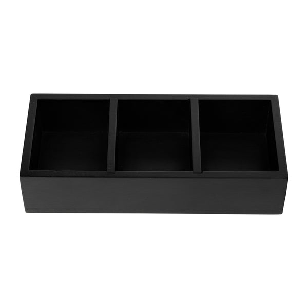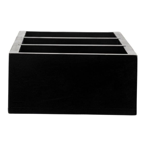 Elegantly organize your condiments with our Restpresso Rectangle Black Bamboo Packet Organizer. This chic sugar packet contains 3 compartments to easily arrange an assortment of condiment packets and provides easy access to customers. The slim design of this eco-friendly tea packet organizer provides space-saving storage and allows employees to quickly refill the caddy with sugar packets, tea packets, sweeteners, and more. With a sleek black finish, this bamboo packet holder effortlessly matches the modern decor of your coffee shop, diner, or breakfast buffet. The overall measurement of this rectangular sugar packet caddy is 9.5 inches long by 4.25 inches wide. Each packet organizer compartment measures 3.6 inches long by 2.6 inches wide, which allows you to store an ample amount of supplies. Sold in a 1 count box.
