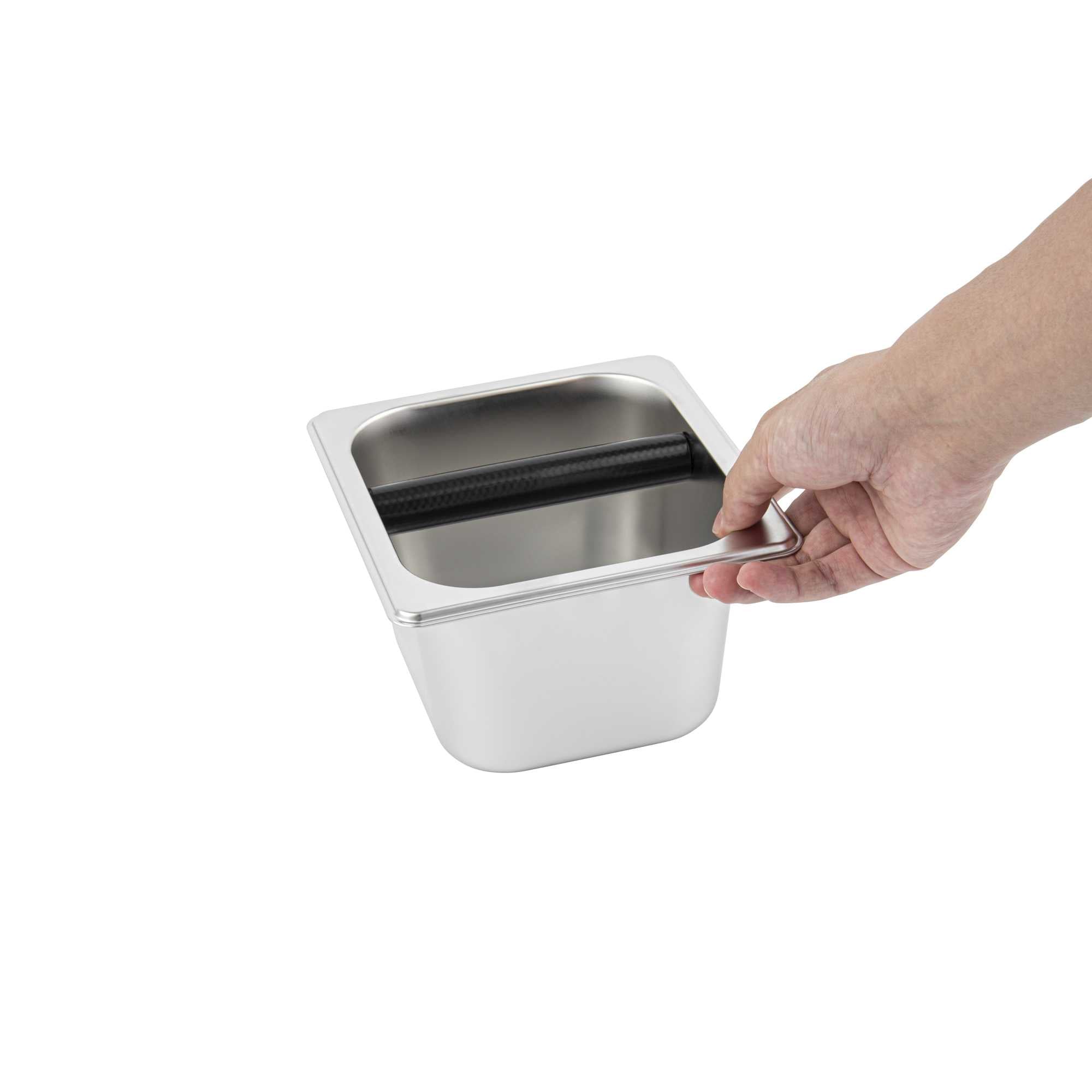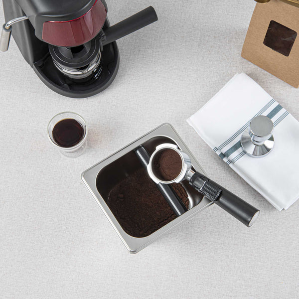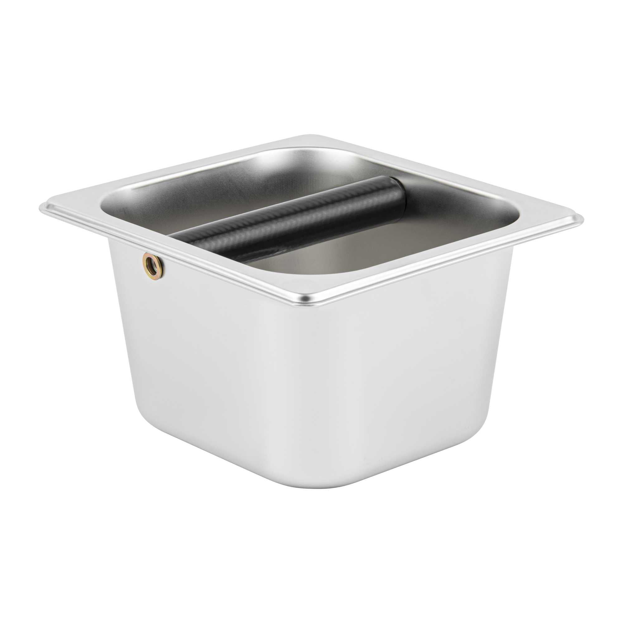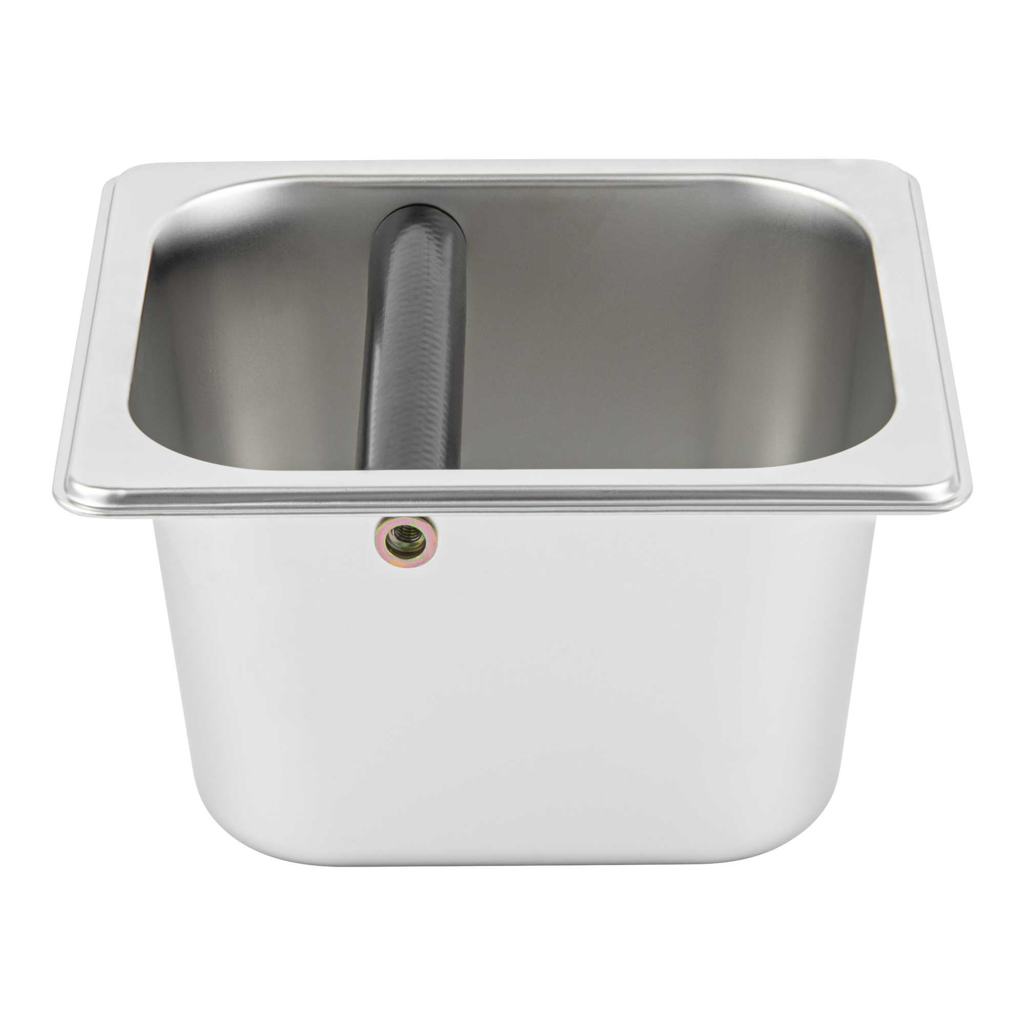 Enhance your coffee station's efficiency with a versatile espresso grounds disposal solution. The Restpresso Stainless Steel Coffee / Espresso Knock Box is crafted from durable stainless steel, ensuring longevity and daily usability in bustling coffee shops. Its sleek silver finish not only adds a professional aesthetic to any coffee preparation area but also seamlessly complements modern kitchen aesthetics, making it an ideal coffee knock box for stylish baristas. Featuring compact dimensions of 6.9 inches by 6.4 inches by 4 inches, it fits neatly in limited spaces, such as espresso machine trays or countertops, without occupying excessive room. The removable rubber knock bar simplifies the disposal of coffee grounds and cleaning, while its non-slip base provides stability, preventing unwanted movement on countertops. Plus, it's dishwasher safe, offering quick and efficient cleaning, making it an excellent barista knock box for maintaining cleanliness. Sold in a 1 count box.