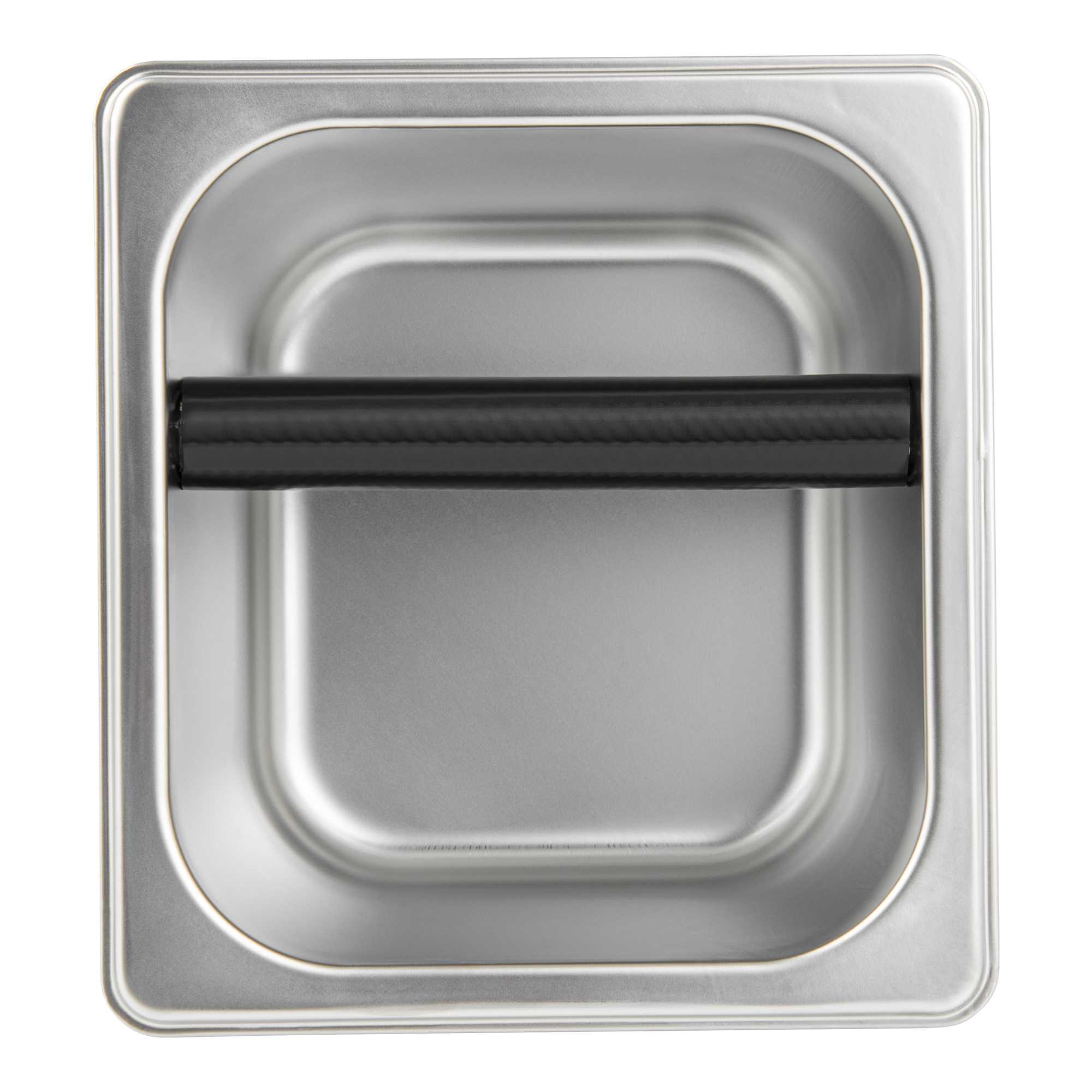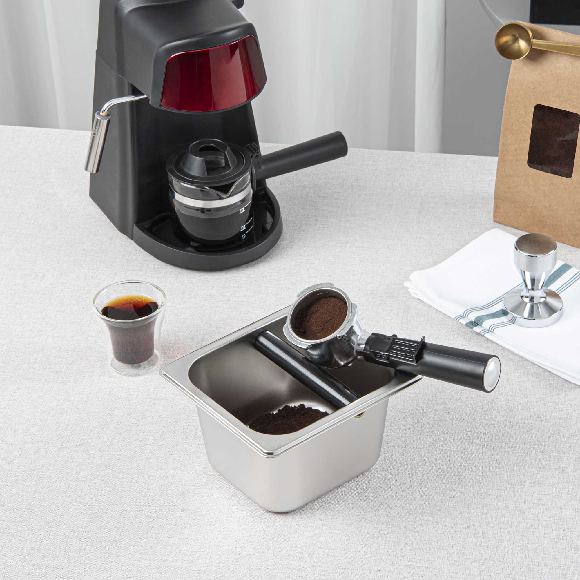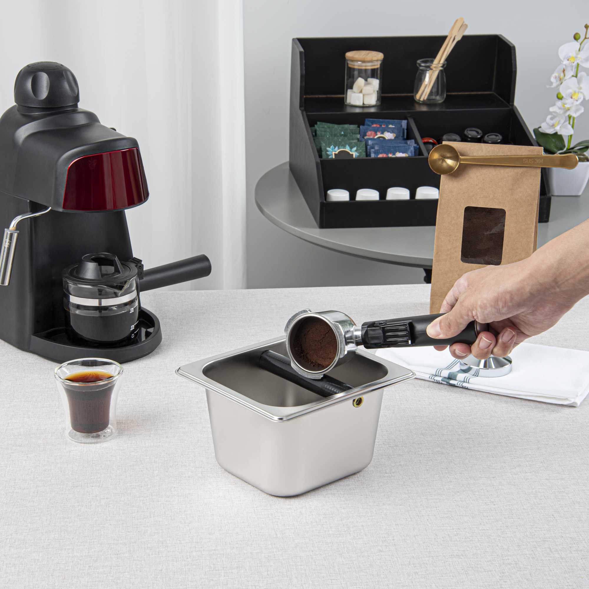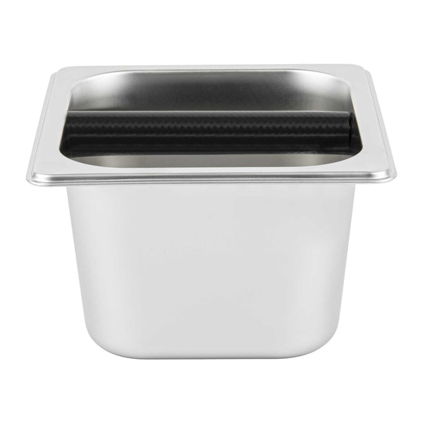 Enhance your coffee station's efficiency with a versatile espresso grounds disposal solution. The Restpresso Stainless Steel Coffee / Espresso Knock Box is crafted from durable stainless steel, ensuring longevity and daily usability in bustling coffee shops. Its sleek silver finish not only adds a professional aesthetic to any coffee preparation area but also seamlessly complements modern kitchen aesthetics, making it an ideal coffee knock box for stylish baristas. Featuring compact dimensions of 6.9 inches by 6.4 inches by 4 inches, it fits neatly in limited spaces, such as espresso machine trays or countertops, without occupying excessive room. The removable rubber knock bar simplifies the disposal of coffee grounds and cleaning, while its non-slip base provides stability, preventing unwanted movement on countertops. Plus, it's dishwasher safe, offering quick and efficient cleaning, making it an excellent barista knock box for maintaining cleanliness. Sold in a 1 count box.