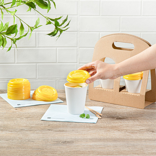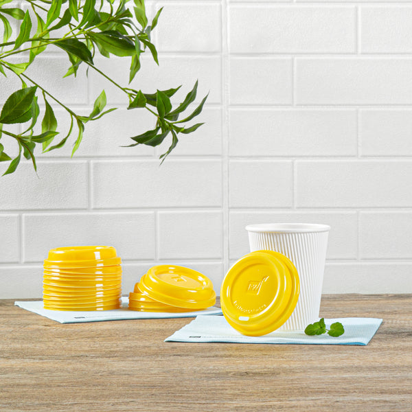 Securely enjoy beverages with our Restpresso Yellow Plastic Coffee Cup Lids. These disposable coffee cup lids are designed to form a tight seal with our collection of compatible Restpresso 8-ounce, 12-ounce, 16-ounce, and 20-ounce paper coffee cups, preventing spills while taking coffee on-the-go. Equipped with a built-in ventilation hole, these plastic lids improve airflow, allowing guests to sip on their beverages smoothly. The elevated rim of these hot cup lids minimizes minor spills and provides customers with a comfortable drinking experience. With a vibrant yellow finish, these to go cup lids add a splash of color and enhance the look of coffee orders. These cup lids are disposable and can be discarded after drinking for an easy cleanup. Ideal for cafes and restaurants looking to reduce their carbon footprint, these yellow plastic lids are recyclable. Measuring 3.5 inches in diameter by 0.75 inches in height, these disposable lids fit snugly on your coffee cups. Sold in a 500 count box. Cups are available and sold separately.