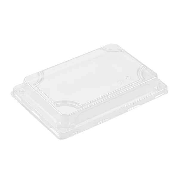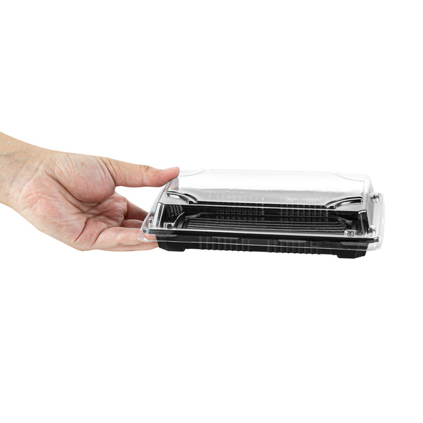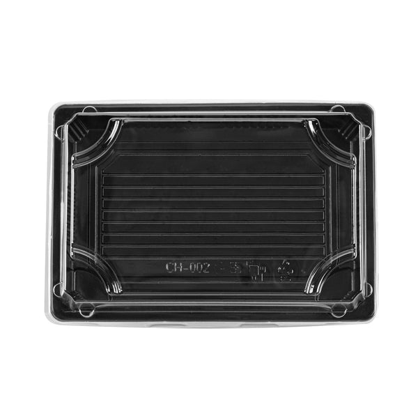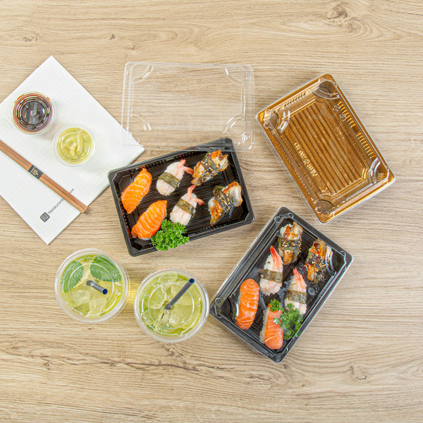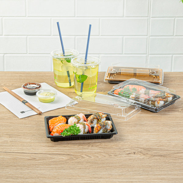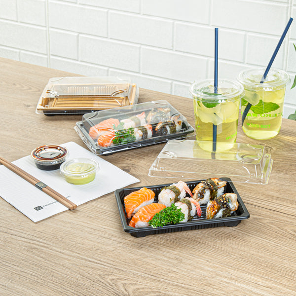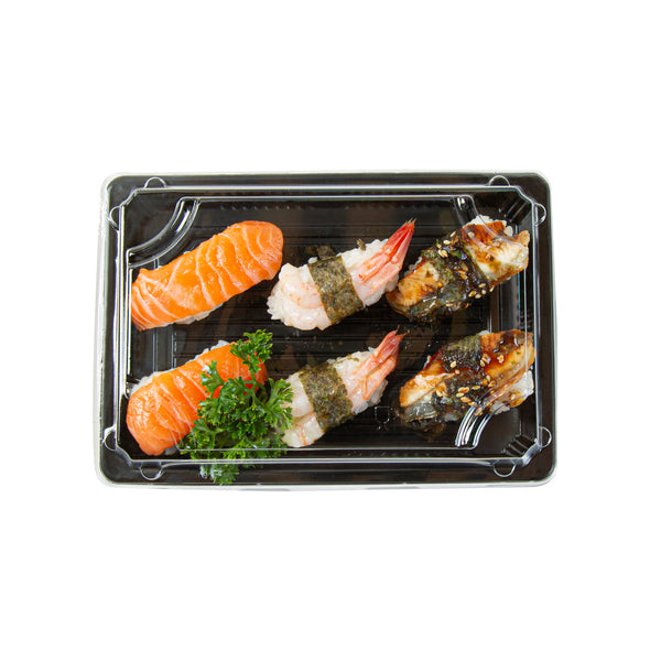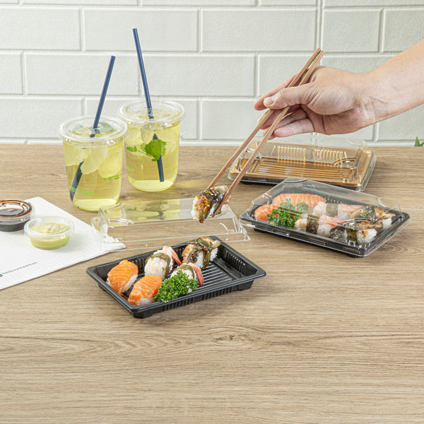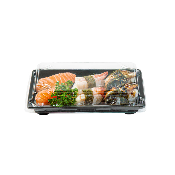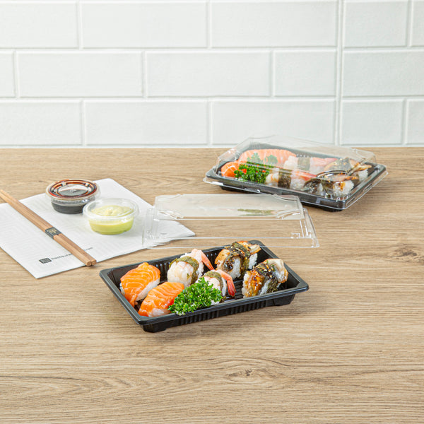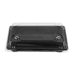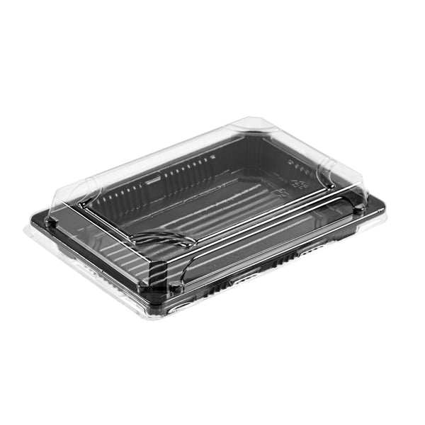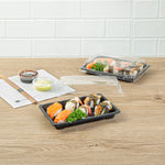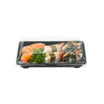 RECTANGLE BLACK PLASTIC TAKE OUT SUSHI TRAY - WITH CLEAR LID