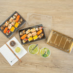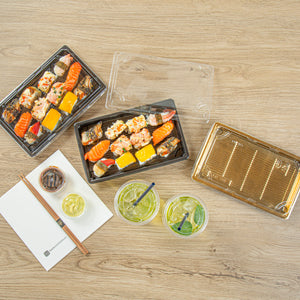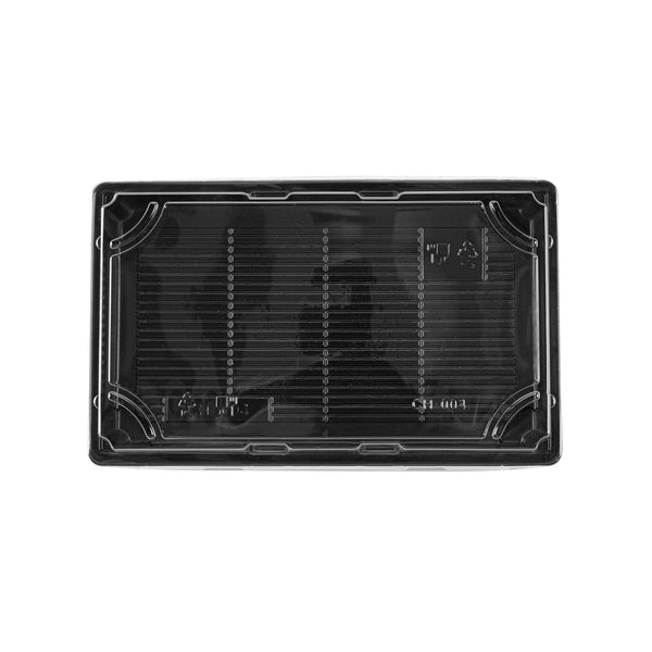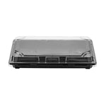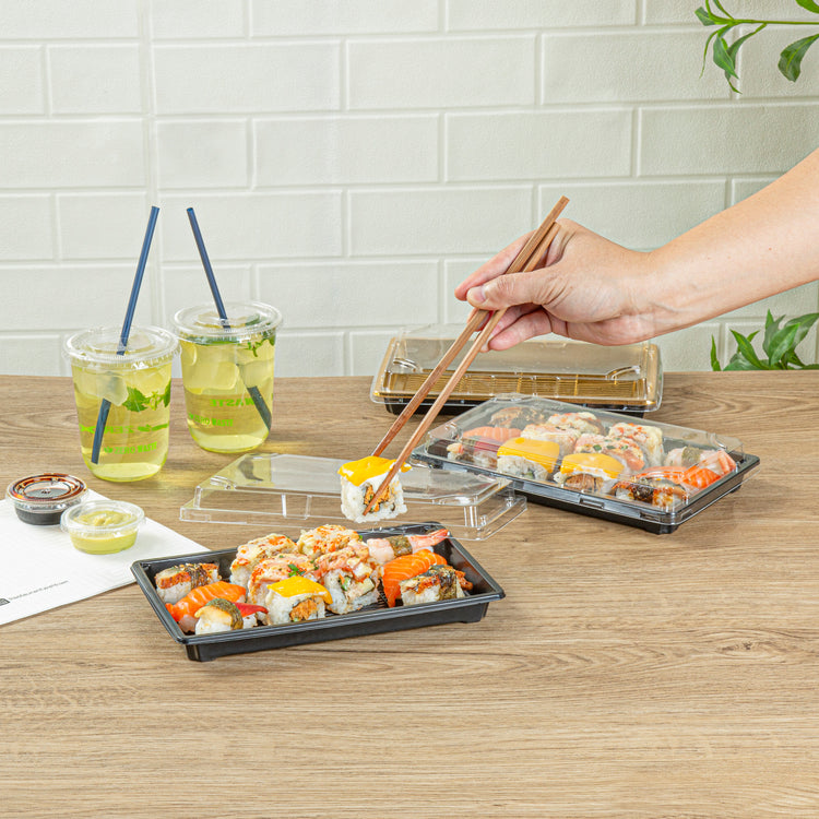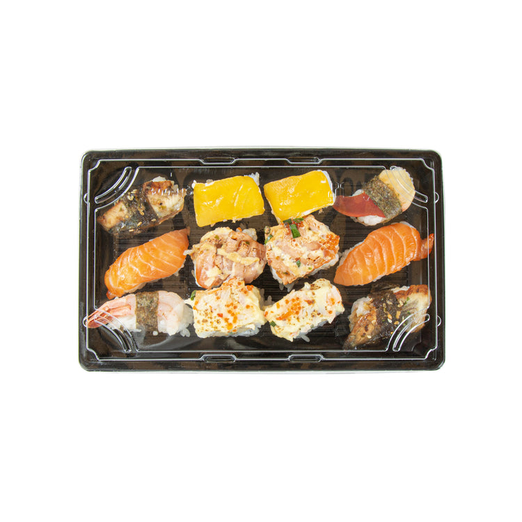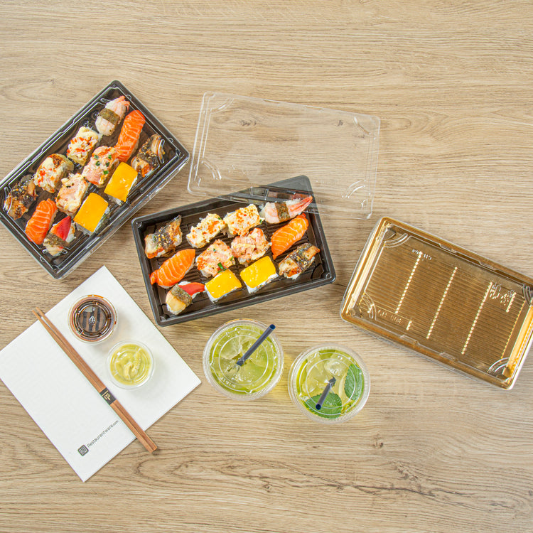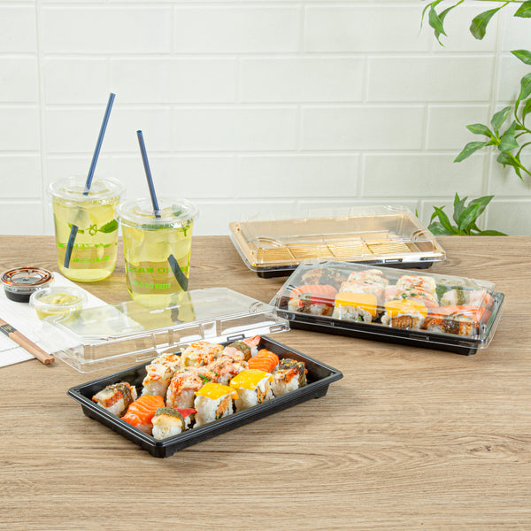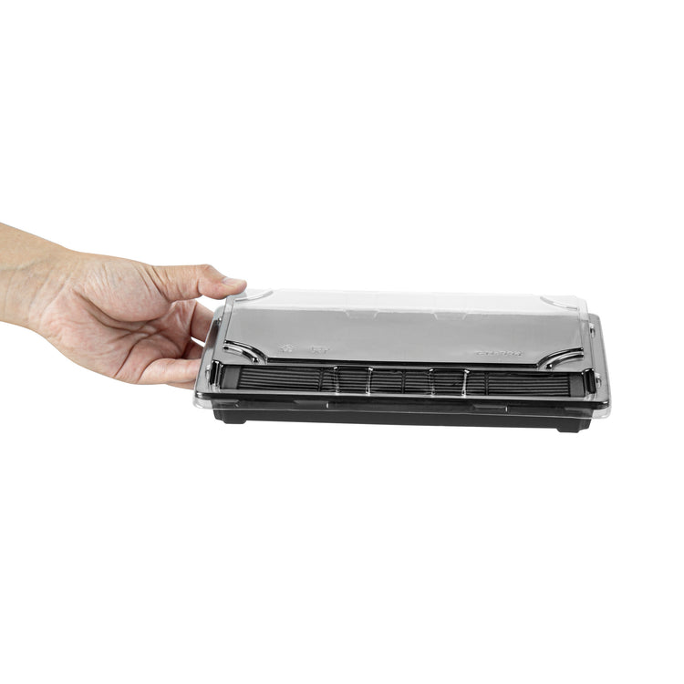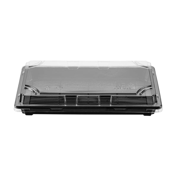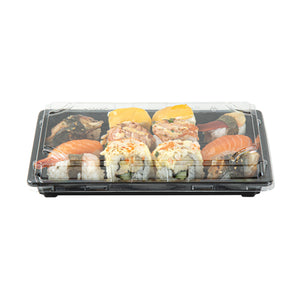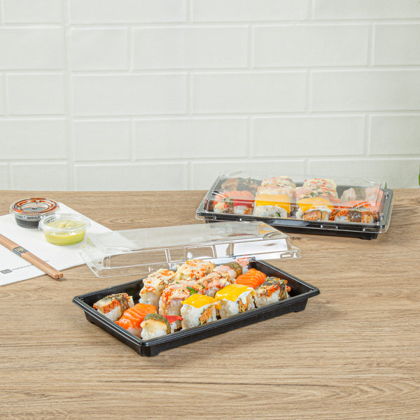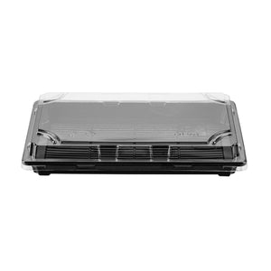 RECTANGLE BLACK PLASTIC TAKE OUT SUSHI TRAY - WITH CLEAR LID