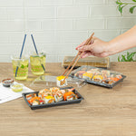 Preserve the aesthetic and freshness of your sushi creations effortlessly. Roku Leak-Resistant Sushi Containers with Lids feature a grease-resistant design, ensuring the quality of each roll remains impeccable during transit. With snap-on lids, these sushi containers with lids maintain the freshness of your culinary masterpieces while allowing for clear visibility, thanks to their anti-fog performance. Measuring 9.25 inches in length, these PS plastic trays are ideal for sushi restaurants offering takeout or delivery services. Their curved and indented corners prevent cracking or breaking, making them durable disposable sushi containers that withstand the demands of foodservice settings. Freezer-safe material offers versatile storage, catering to diverse operational needs. Perfect for takeout sushi trays in supermarkets or convenience stores. Each order includes 100 Roku Leak-Resistant Sushi Containers with Lids.