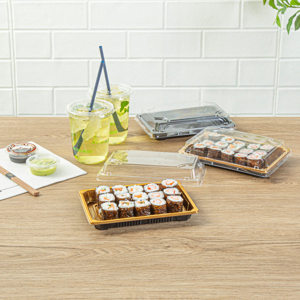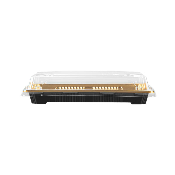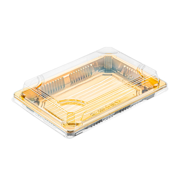 RECTANGLE GOLD PLASTIC TAKE OUT SUSHI TRAY - WITH CLEAR LID