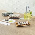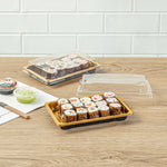 Ensure flawless presentation with leak-resistant sushi trays. Roku Leak-Resistant Gold Plastic Sushi Trays With Lids feature a grease-resistant design that ensures sauces stay contained, preserving the integrity of each sushi roll. Each tray includes clear, snap-on lids that keep sushi fresh while showcasing your culinary artistry, perfect for takeout sushi trays in restaurants or catering events. With anti-fog performance, these trays maintain visibility in cold storage, making them ideal for grocery stores offering pre-packaged sushi. Measuring 7.09 inches in length, 4.92 inches in width, and 1.57 inches in height, these trays are designed for cold food, ensuring freshness in storage. Enhance your sushi offerings with these reliable trays. Each order includes 100 Roku Leak-Resistant Gold Plastic Sushi Trays With Lids.