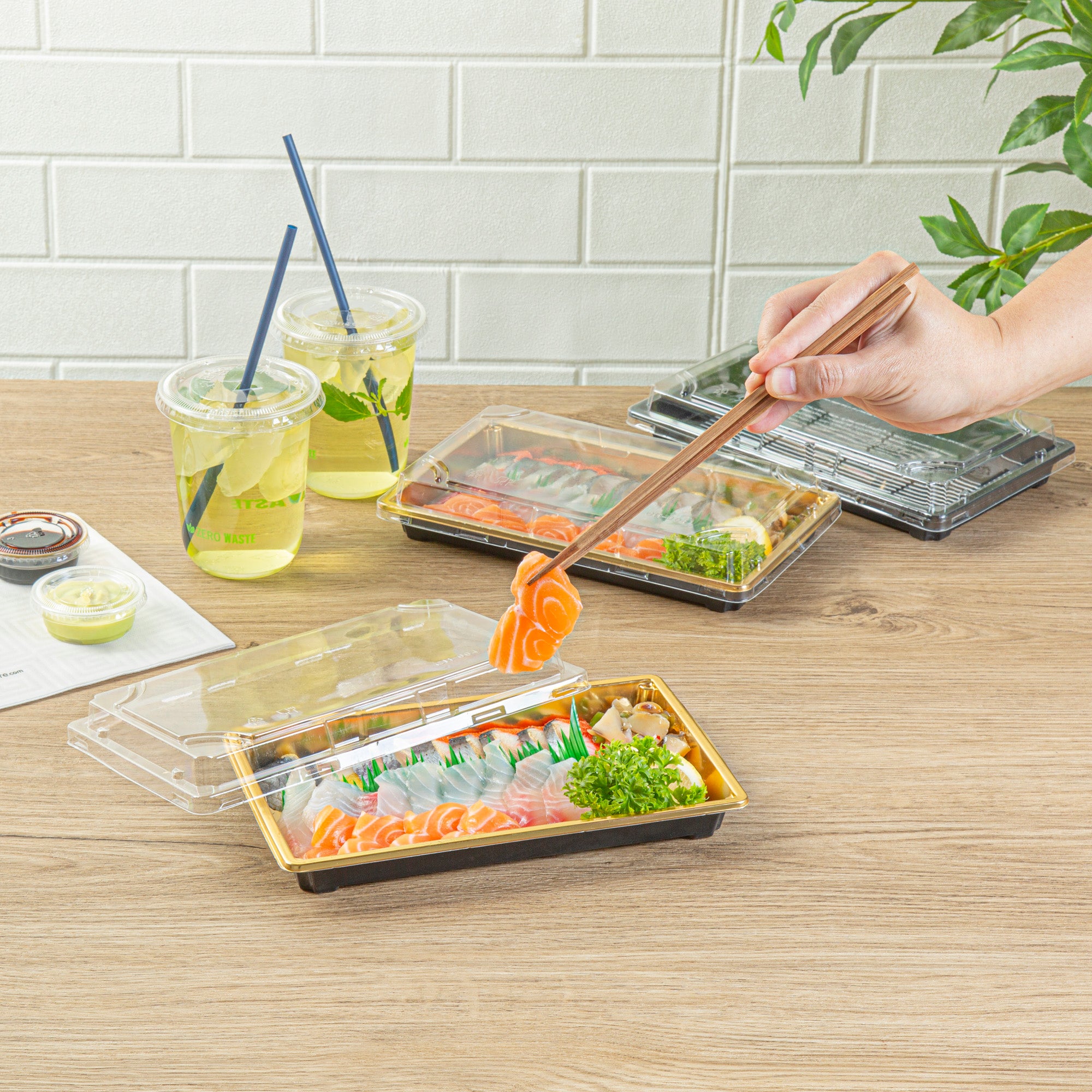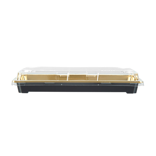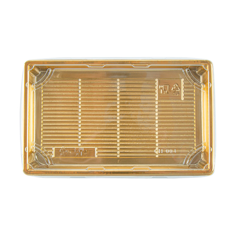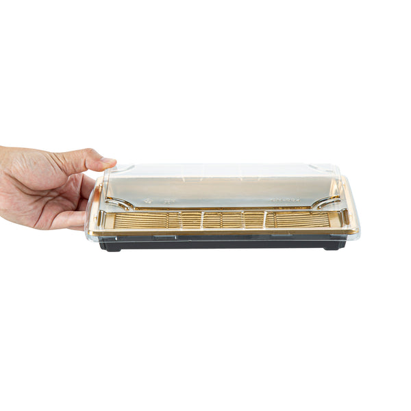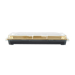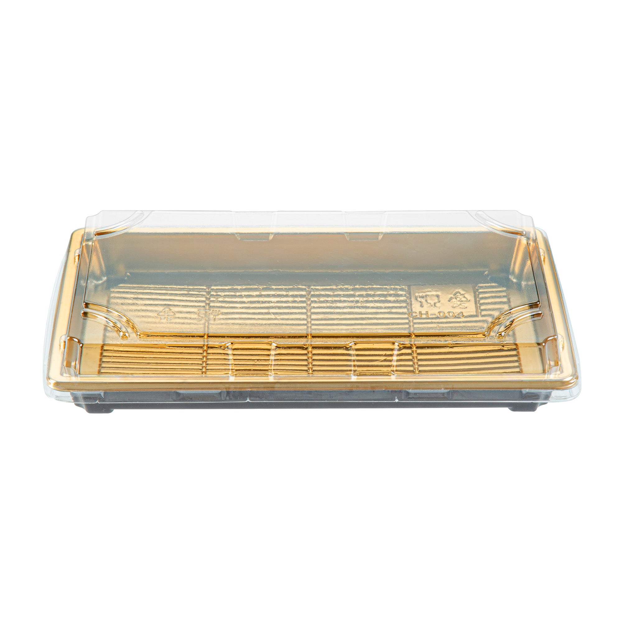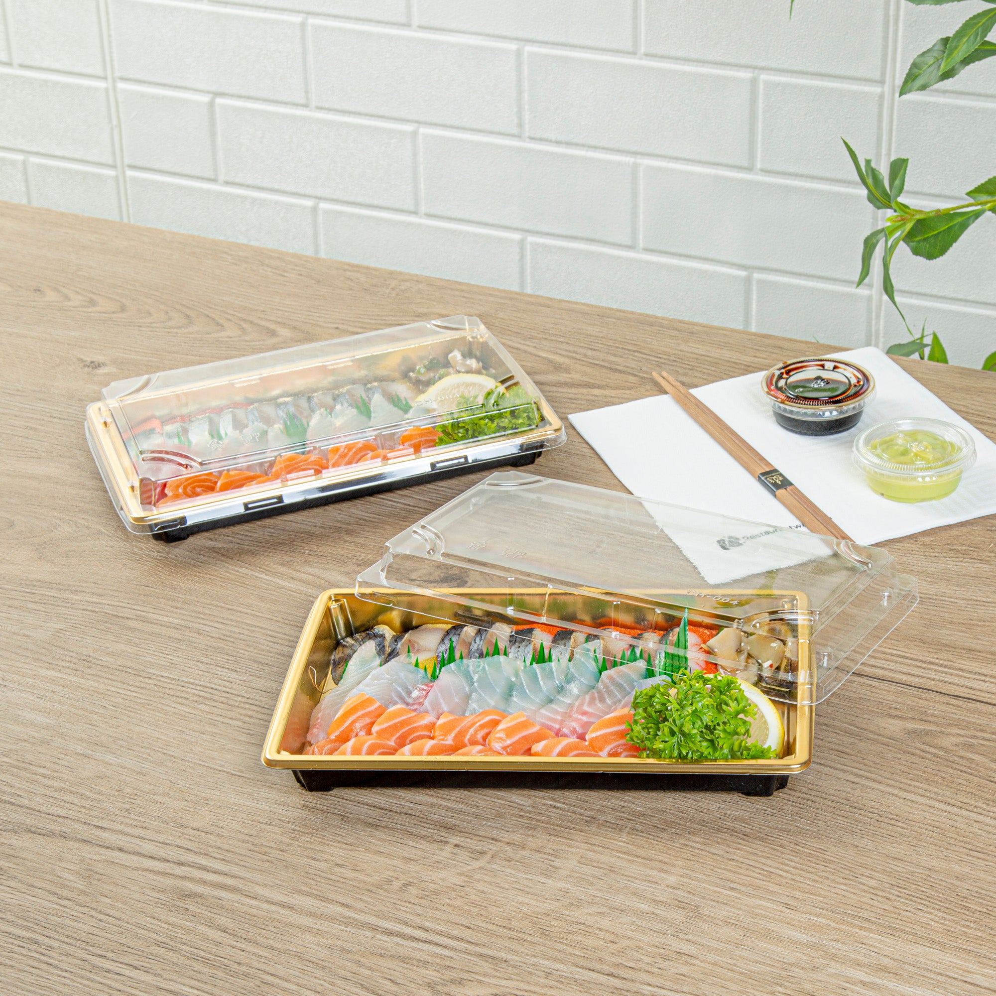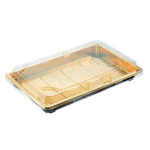 RECTANGLE GOLD PLASTIC TAKE OUT SUSHI TRAY - WITH CLEAR LID