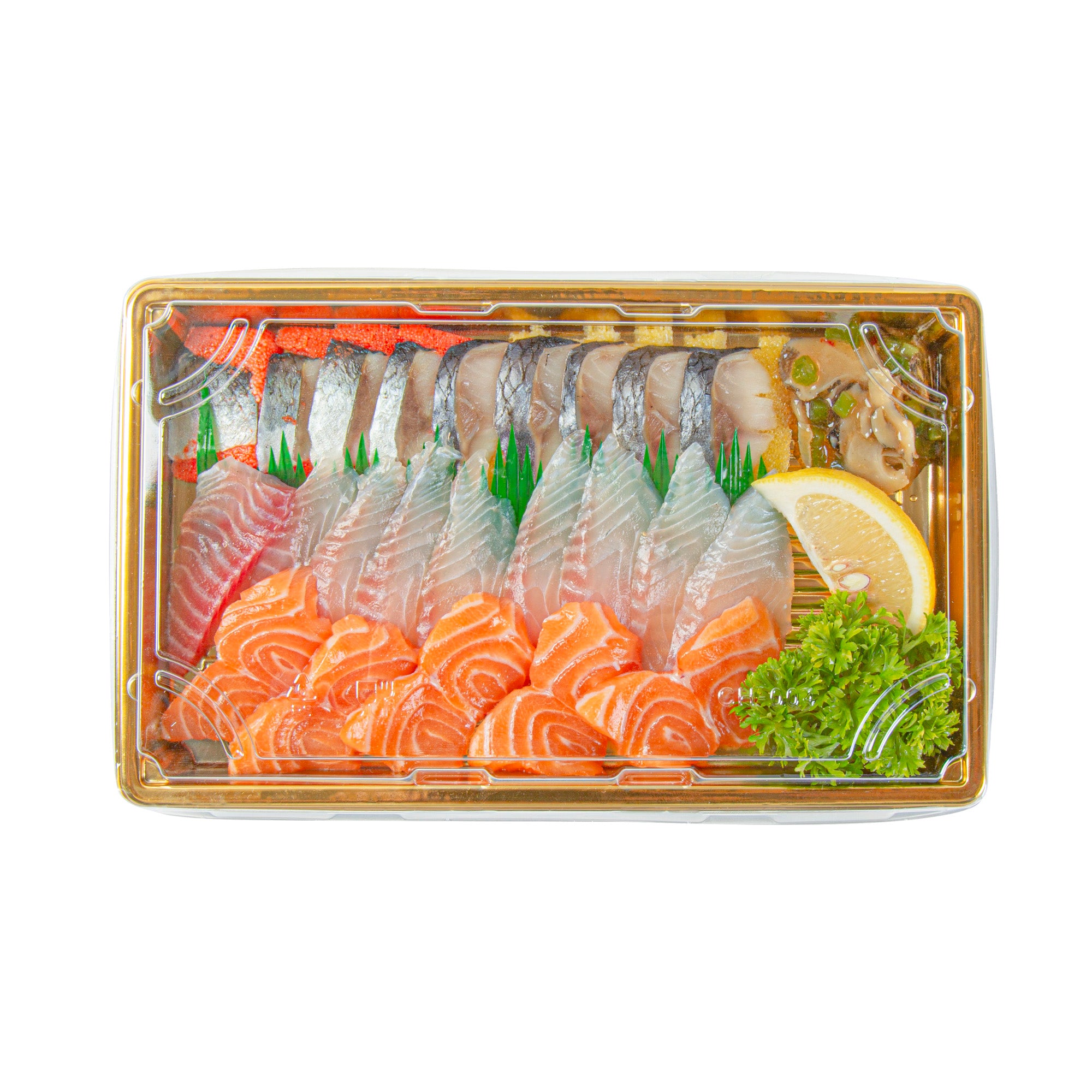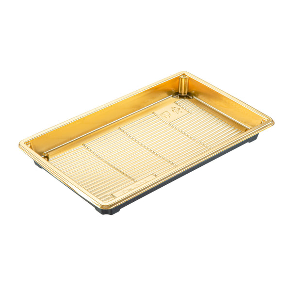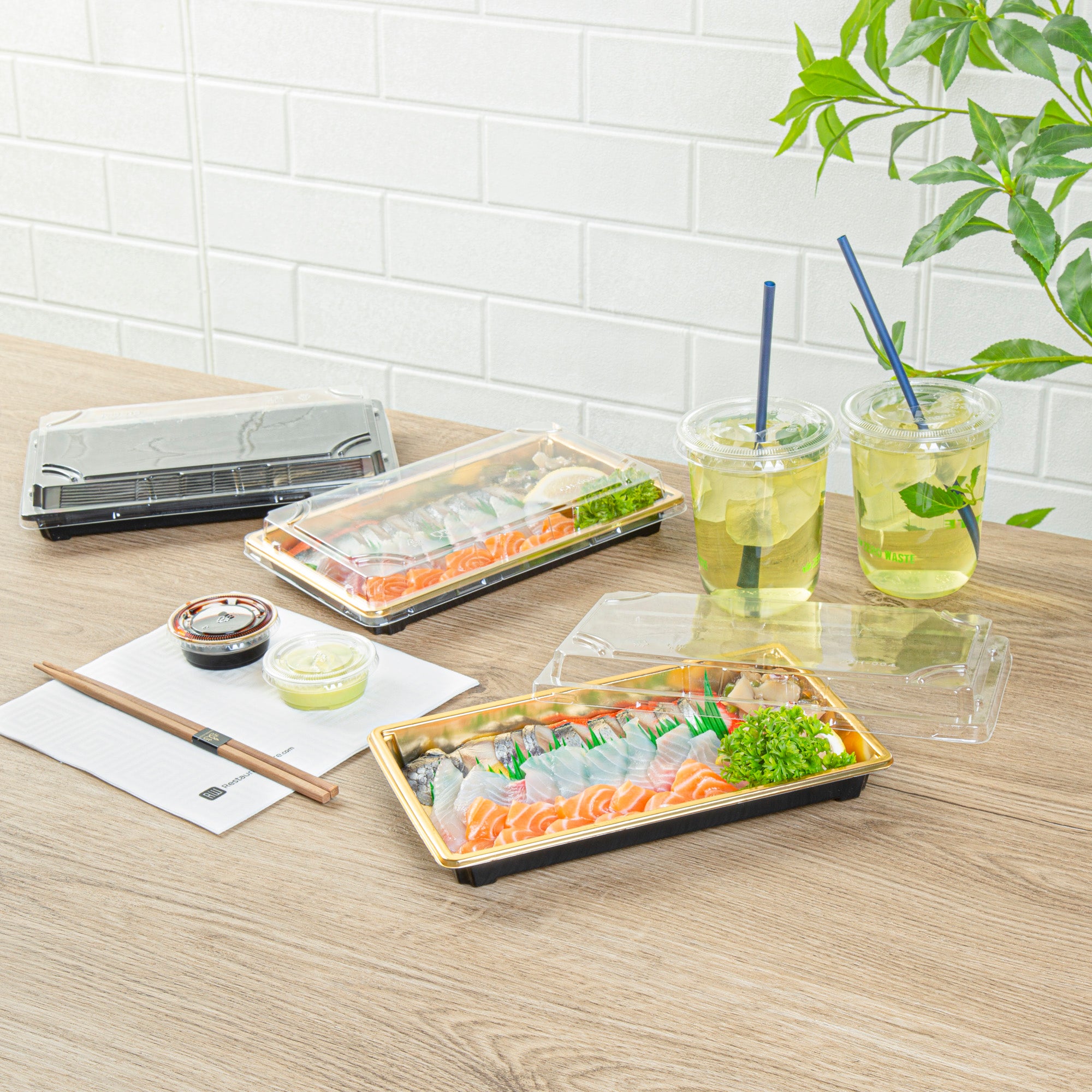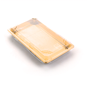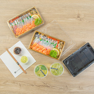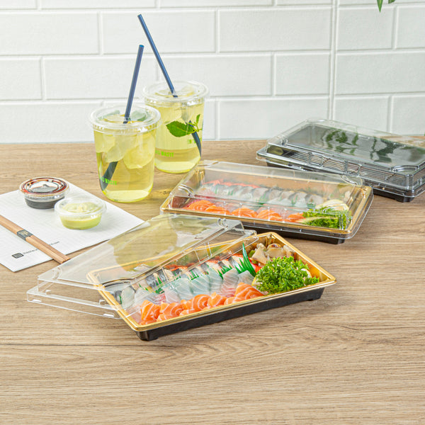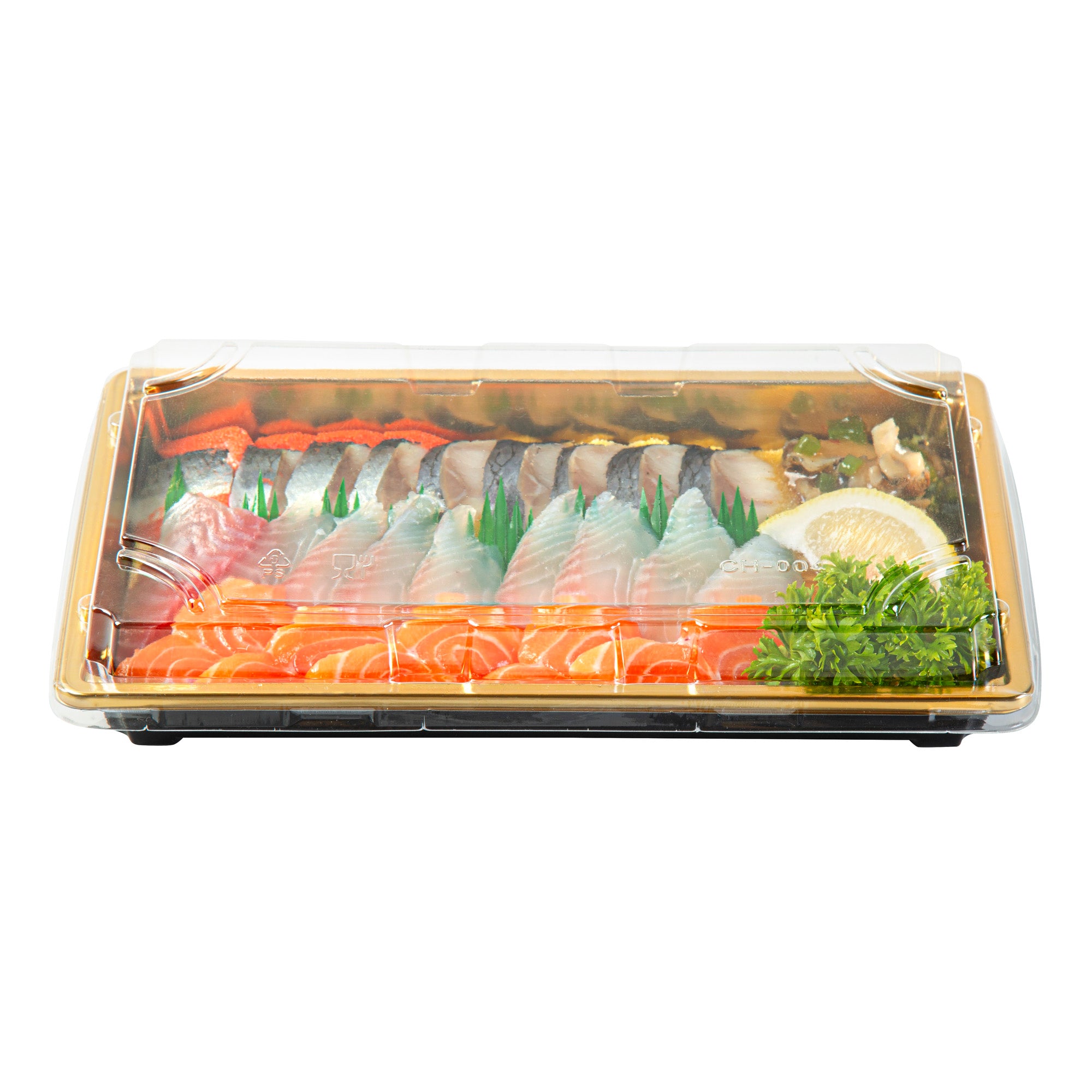 RECTANGLE GOLD PLASTIC TAKE OUT SUSHI TRAY - WITH CLEAR LID