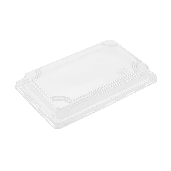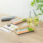 Ensure sushi presentation remains pristine with leak-resistant packaging. Roku Grease-Resistant Plastic Sushi Containers come equipped with grease-resistant and leak-resistant features, ensuring that sauces and oils stay contained, maintaining the freshness and presentation of sushi rolls on the go. The clear lids snap securely onto the trays, providing airtight storage for sushi rolls, while the anti-fog performance guarantees clear visibility in refrigeration displays, making these clear lid sushi containers ideal for grab-and-go setups. Measuring 9.25 inches in length, 5.91 inches in width, and 1.77 inches in height, these disposable sushi trays are perfect for sushi restaurants, catering events, and grocery stores. Enhance your takeout service by opting for these reliable and visually appealing sushi containers. Each order includes 100 Roku Grease-Resistant Plastic Sushi Containers.
