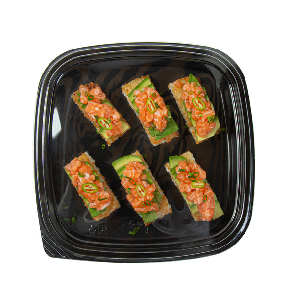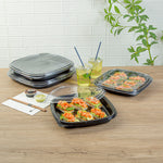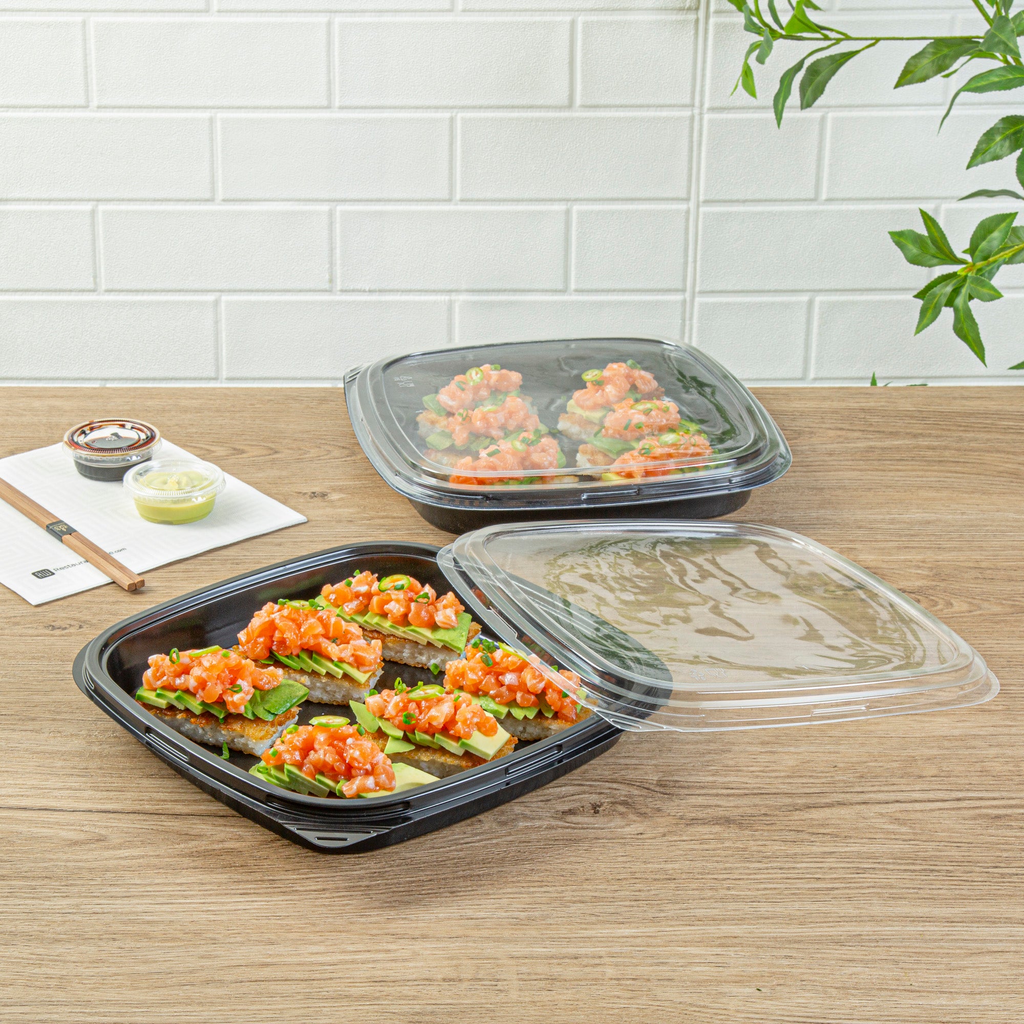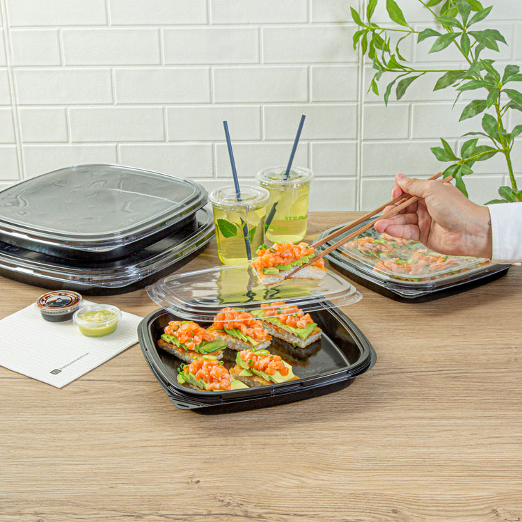 Ensure your sushi stays fresh and appetizing with leak-resistant packaging. The Roku Leak-Resistant Black Plastic Disposable Sushi Tray combines a grease-resistant design to keep sauces contained, enhancing the convenience of on-the-go dining. Made from plastic, this takeout sushi container includes snap-on lids that preserve the freshness of your sushi rolls, making it an ideal choice for restaurants and caterers. Its leak-resistant trays protect surfaces from spills, ensuring clean and efficient service. With dimensions of 10.63 inches by 10.63 inches by 1.77 inches, these trays offer ample space for various sushi presentations while maintaining durability. Elevate your foodservice operations by ensuring freshness and cleanliness with this snap-on lid sushi tray. Each order includes 100 Roku Leak-Resistant Black Plastic Disposable Sushi Trays.