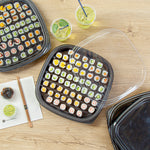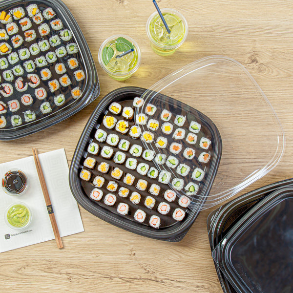 Ensure optimal freshness and presentation with leak-resistant sushi packaging. The Roku Grease-Resistant Plastic Sushi Container is designed with snap-on lids, effectively sealing in freshness for your expertly crafted sushi rolls. These black plastic sushi containers are grease-resistant, containing sauces and any excess grease effortlessly, which enhances your sushi takeout box offerings. Made from materials that align with sustainability goals, allowing your kitchen to minimize its settingal footprint. Measuring 12.6 inches by 12.6 inches by 1.77 inches, these containers provide ample space for various sushi arrangements, while the anti-fog lids preserve visibility and presentation during transit. Elevate your foodservice operations by utilizing these dependable disposable sushi trays to maintain food quality and customer satisfaction. Each order includes 50 Roku Grease-Resistant Plastic Sushi Containers.