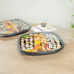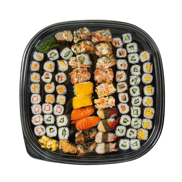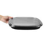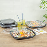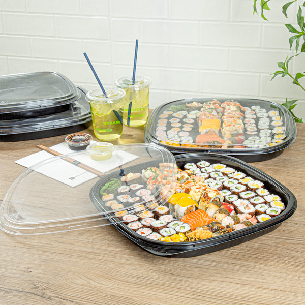 Keep sushi rolls fresh and flavorful with leak-proof packaging. The Roku Black Plastic Disposable Sushi Tray features a grease-resistant design that effectively prevents leaks during transport, ensuring your sushi remains appetizing and mess-free. Equipped with snap-on lids, this sushi takeout tray is perfect for maintaining the freshness of prepared sushi rolls, making it ideal for busy restaurants and catering services. Constructed from plastic, this sushi tray supports your establishment to make a positive impact. Measuring 13.58 inches by 13.58 inches with a height of 1.77 inches, these trays provide ample space for various sushi combinations while their anti-fog lids maintain visibility. Enhance your food presentation and streamline your service with these reliable sushi trays. Each order includes 100 Roku Black Plastic Disposable Sushi Trays.