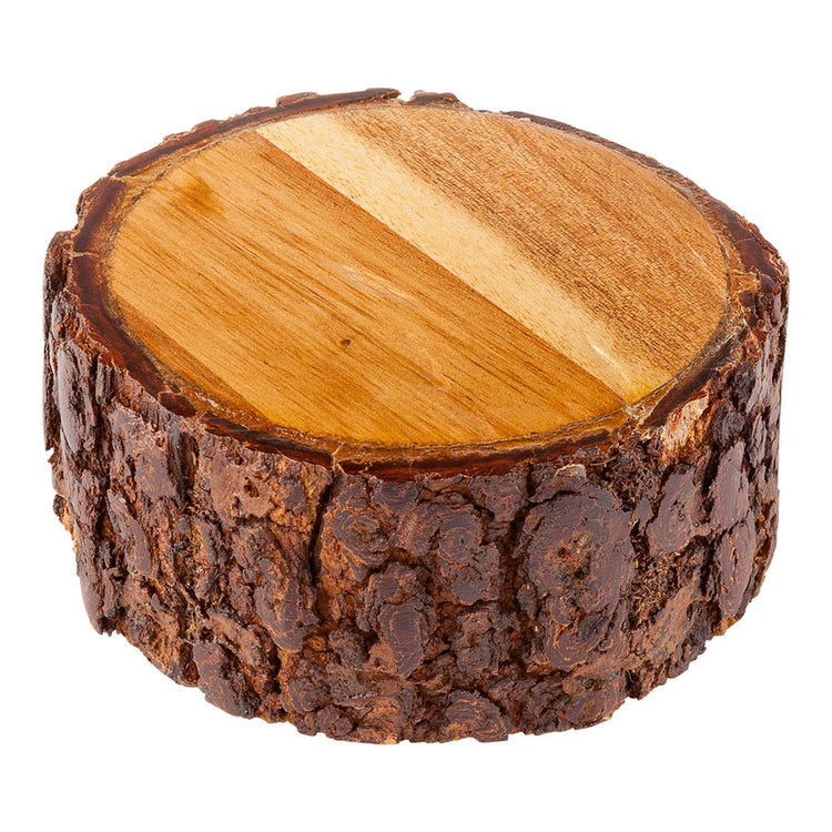 Present your culinary creations using our Eco Display Round Natural Acacia Small Riser. Crafted from premium acacia wood, this wood riser is made for long-lasting use and has a varnished finish to enhance and maintain its high-quality appearance. Featuring a natural bark exterior, this wooden serving tray brings a rustic touch to buffet tables at catering events. Designed to mimic the look of a tree stump, this small wood riser has a flat surface to neatly fit appetizers, pastries, or small cakes. The sturdy hollowed bottom of this lightweight wood riser provides stability on all kinds of surfaces. Measuring 4 inches in diameter and 2 inches in height, this wooden serving tray is sold in a 1 count box.