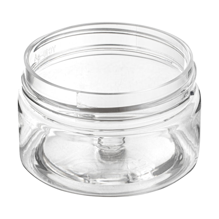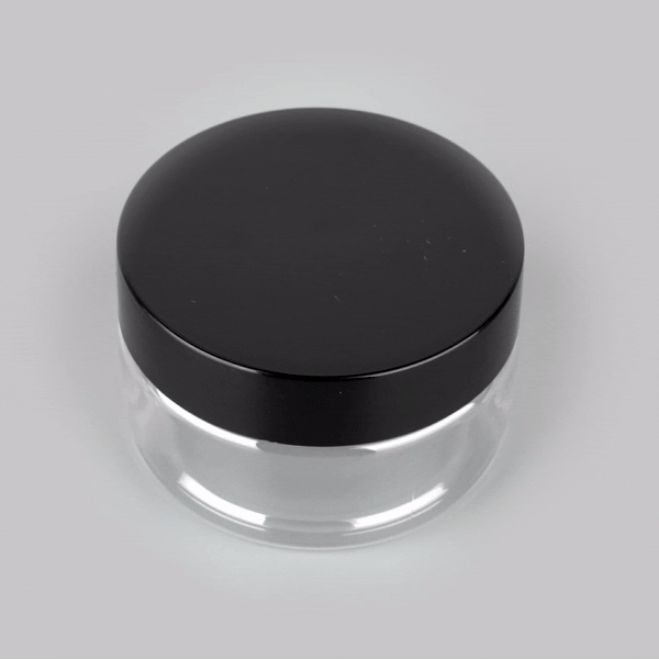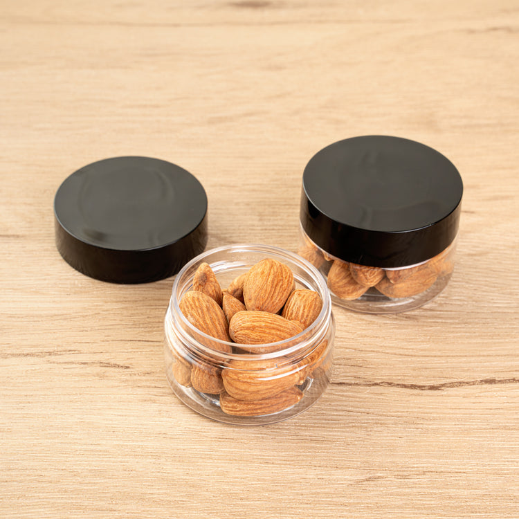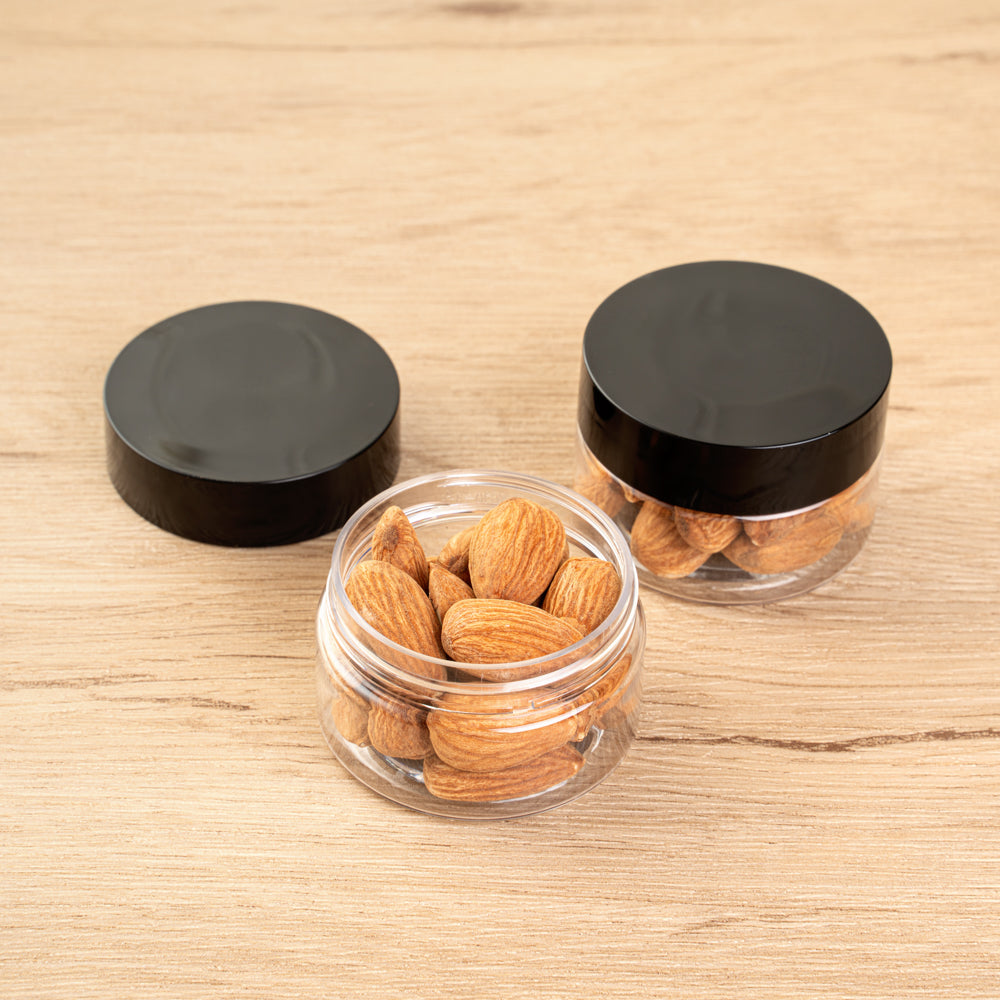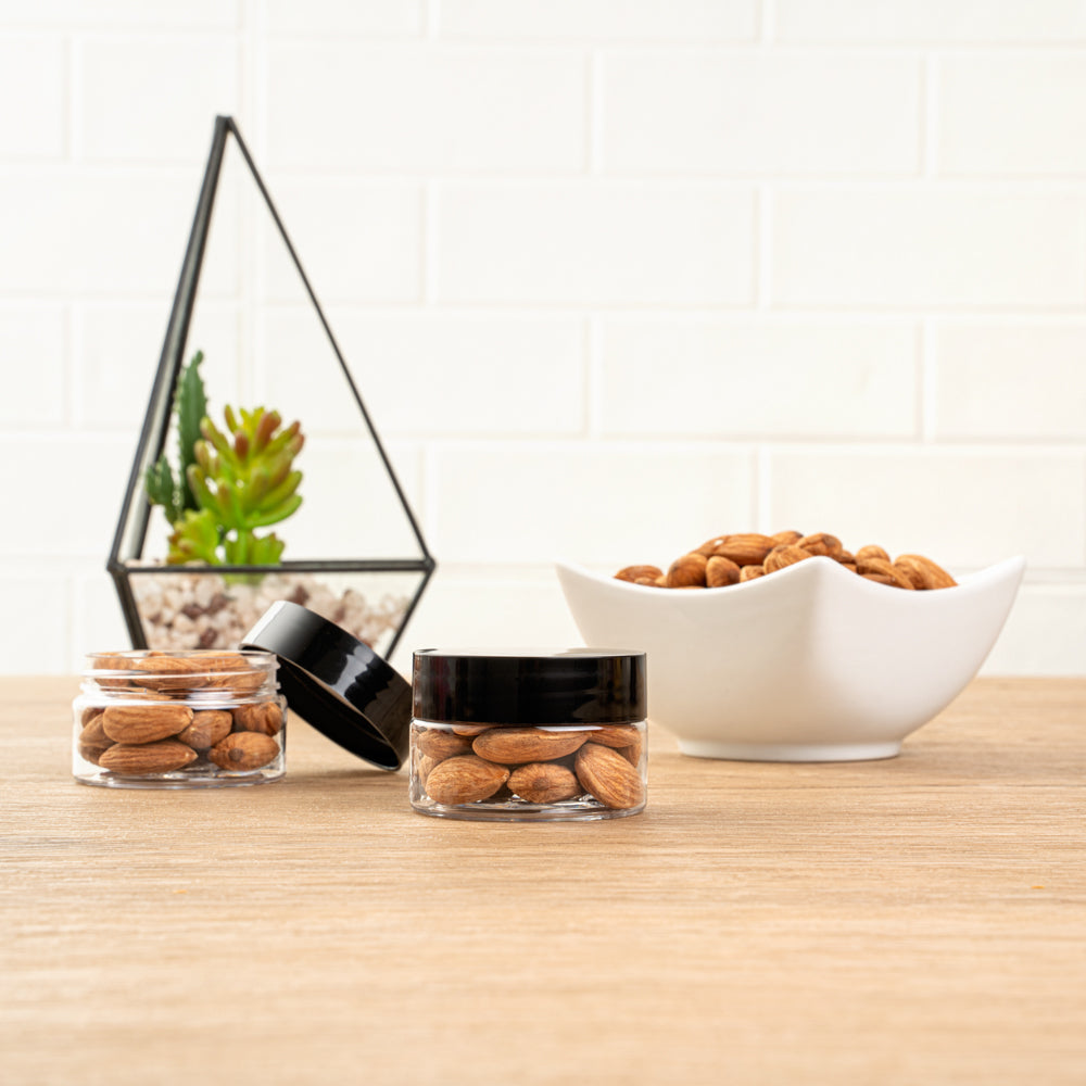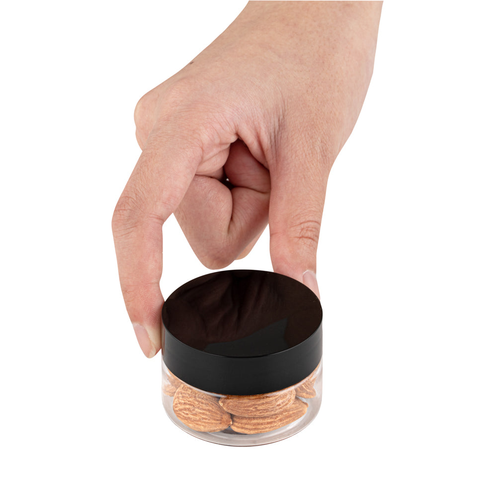 1 OZ ROUND CLEAR PLASTIC CANDY AND SNACK JAR - WITH BLACK PLASTIC LID