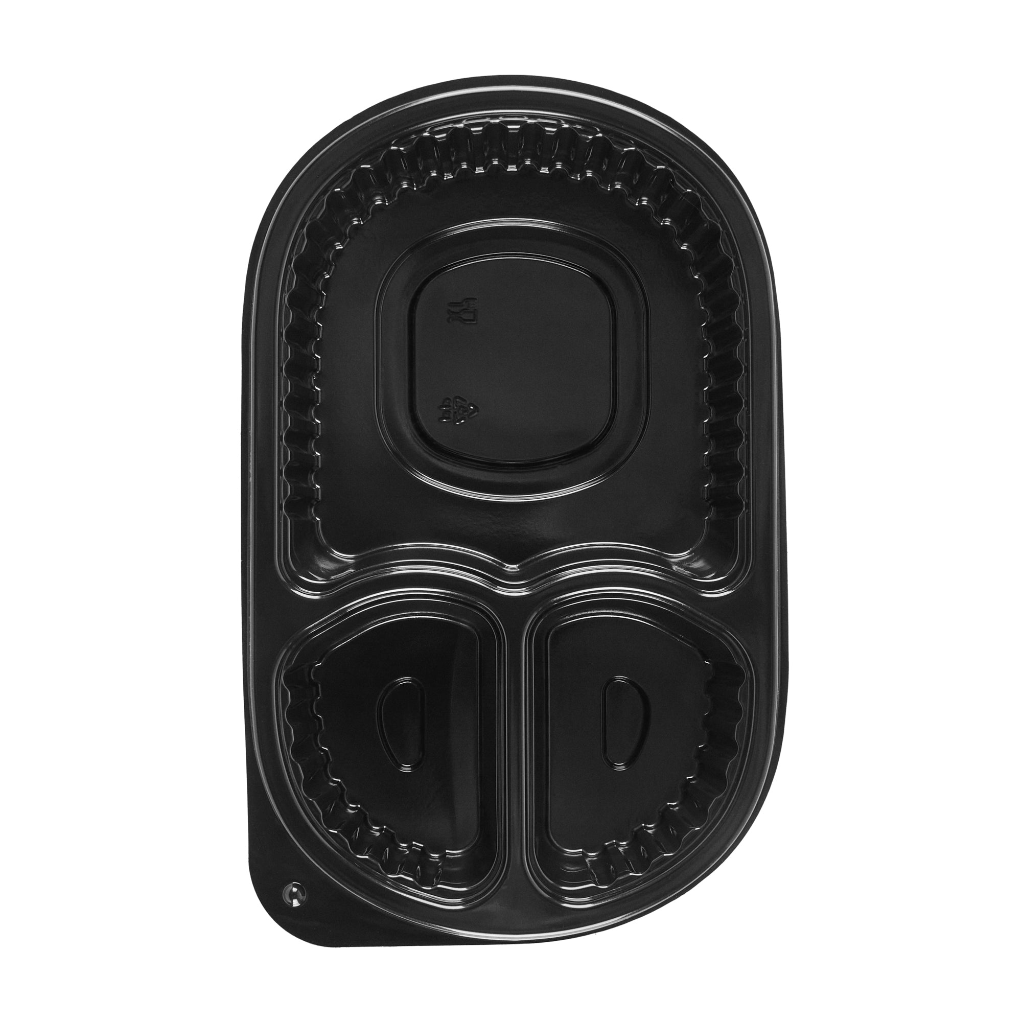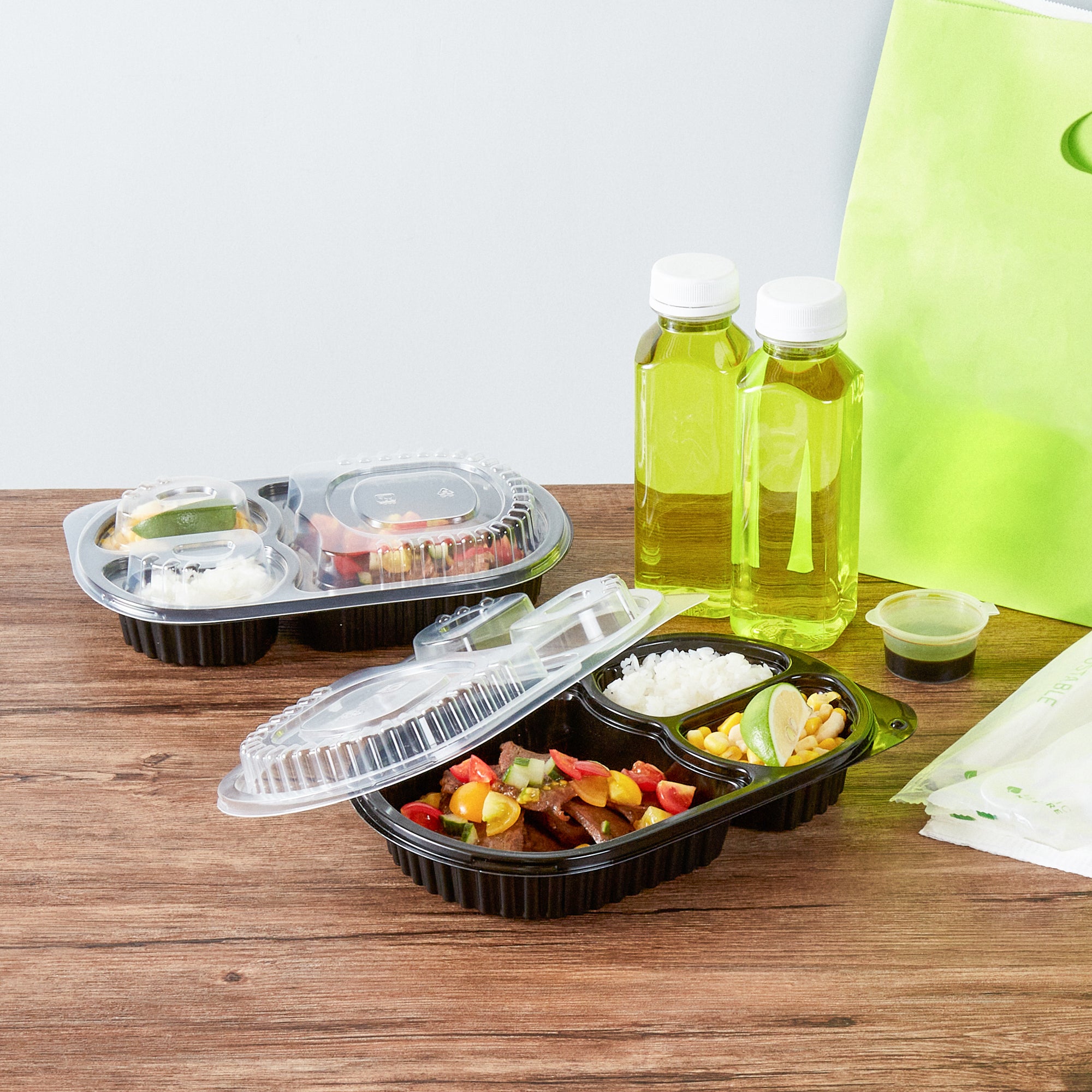 Elevate your meal presentations with our Chef 101 19-ounce Oval Black Plastic 3 Compartment Food Containers. These to go containers feature 3 compartments, allowing you to pack different foods separately and preserve their individual flavors and textures. The included lid of these take out containers forms a secure seal and prevents spills in transit, ensuring your dishes arrive intact. Designed to be microwave-safe, these plastic containers with lids allow customers to reheat meals without changing utensils, adding to their convenience. Crafted from durable plastic, these to go boxes are suitable for holding hot and cold food items. The clear lids of these plastic food containers ensure optimal visibility of their content and facilitate easy identification. These carry out containers have a sleek black finish and add a touch of sophistication to your takeaway meals. Suitable for leftover storage, these food containers with lids are freezer-safe. For eco-minded foodservice establishments, these takeaway containers are recyclable and help minimize your carbon footprint. To ensure an easy cleanup, these disposable food containers can be discarded after use. Measuring 9.25 inches in length by 6 inches in width by 2.25 inches in height, these take out boxes have a capacity of 19 ounces and provide ample space for a variety of dishes. Sold in a 100 count box.