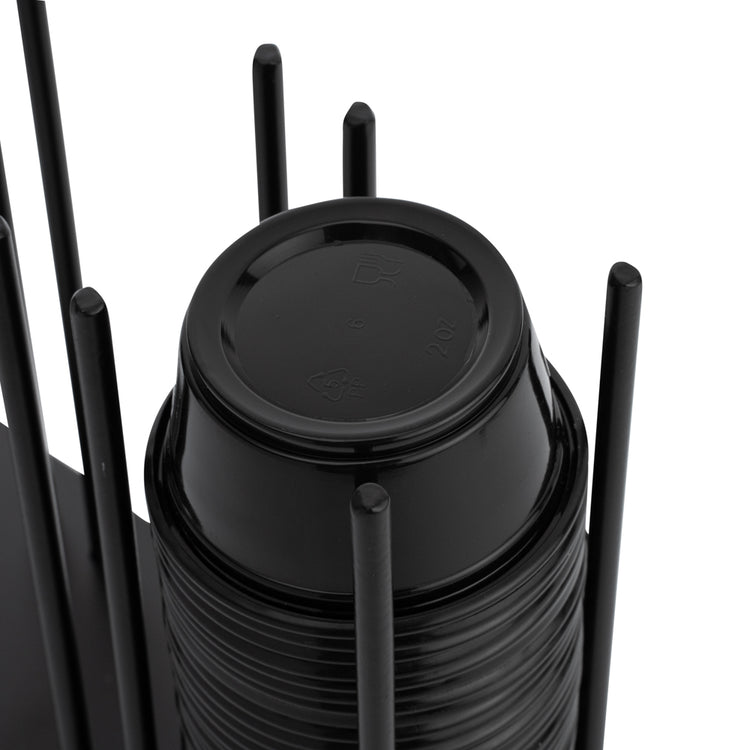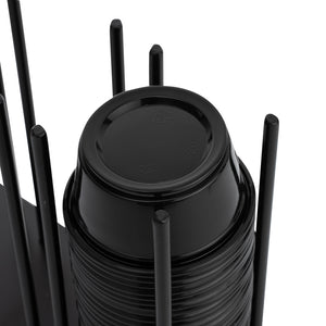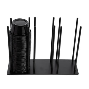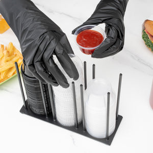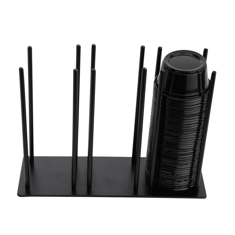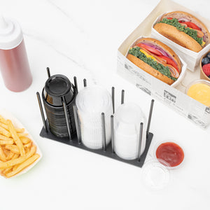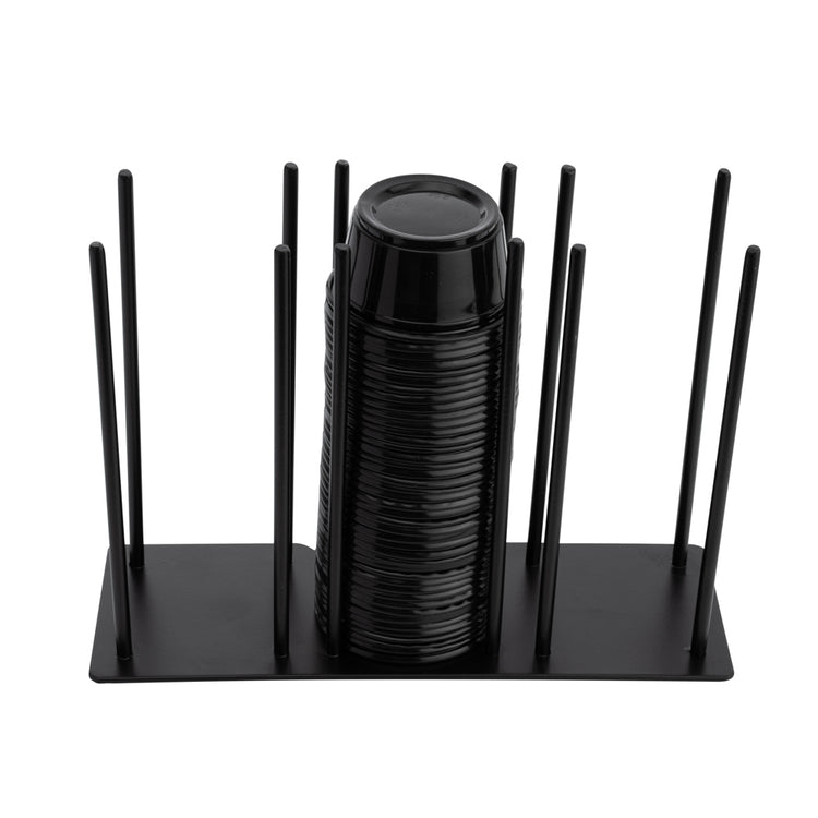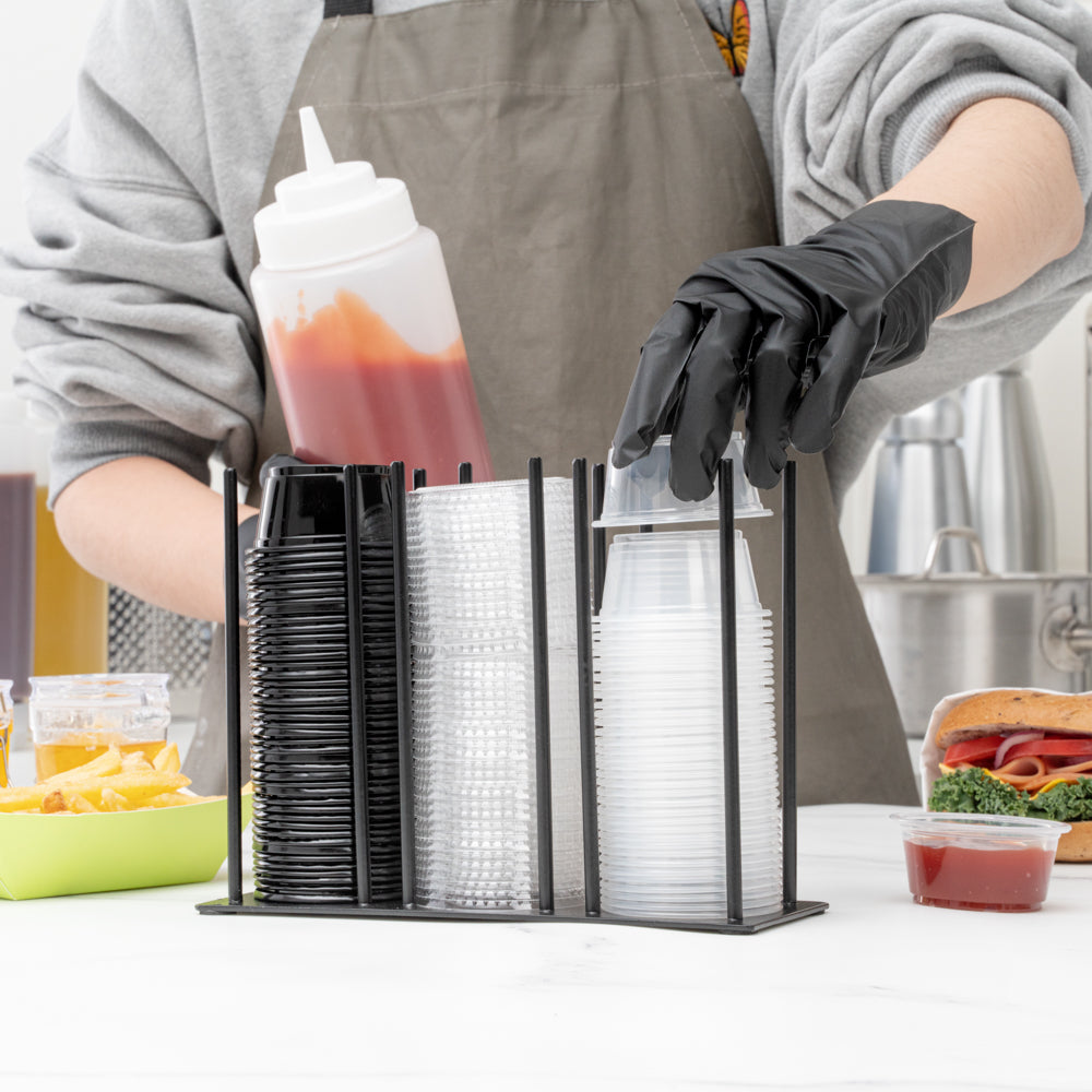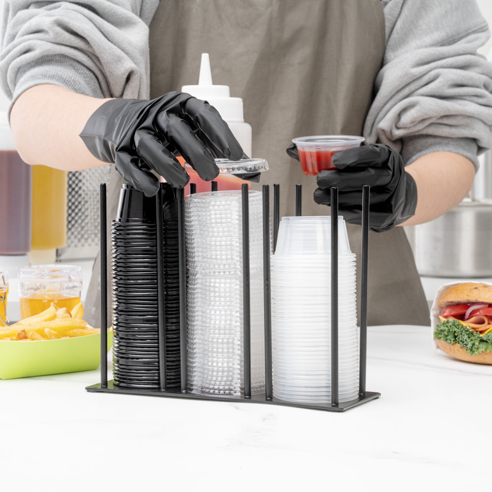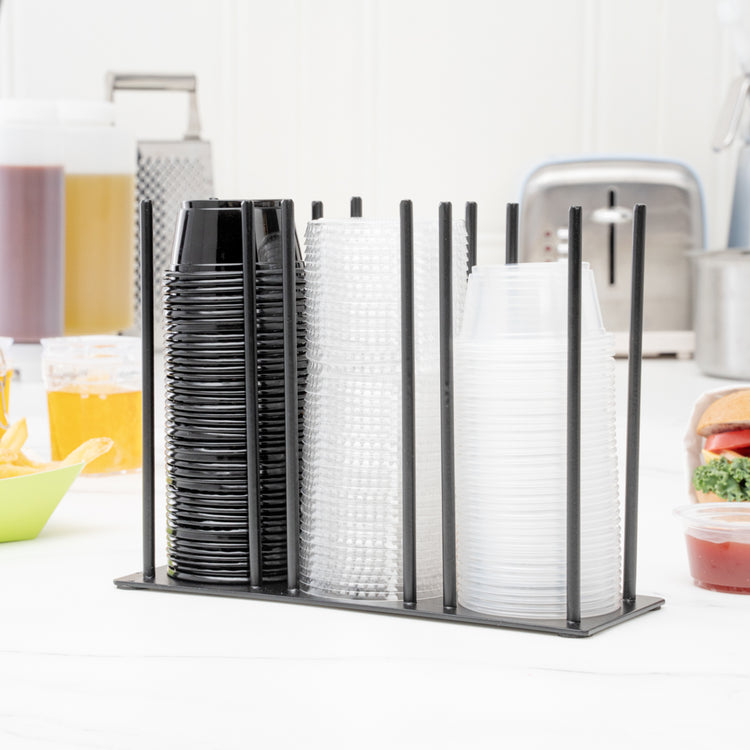 Keep your self-service station neatly organized with our Chef 101 Black Iron Portion Cup / Lid Organizer. With 3 built-in sections, this condiment holder allows you to quickly store and separate sauce cups and lids to provide customers with a hassle-free way to help themselves in your condiment station. Constructed from high-quality iron, this durable ramekin holder is built to endure constant use and keep sauce cups and lids beautifully stacked for guests to easily access. This cup and lid organizer features a black powder finish that protects against corrosion and expertly complements the displays at your concession stand, kiosk, or fast-casual restaurant. Measuring 8.25 inches long by 3 inches wide and 6 inches tall, this condiment cup and lid organizer has a compact design that is perfect for front-of-the-house or back-of-the-house use at your establishment. Shipped in a 1 count box. Please note: our PLA sauce cups and lids are not compatible with this condiment organizer.