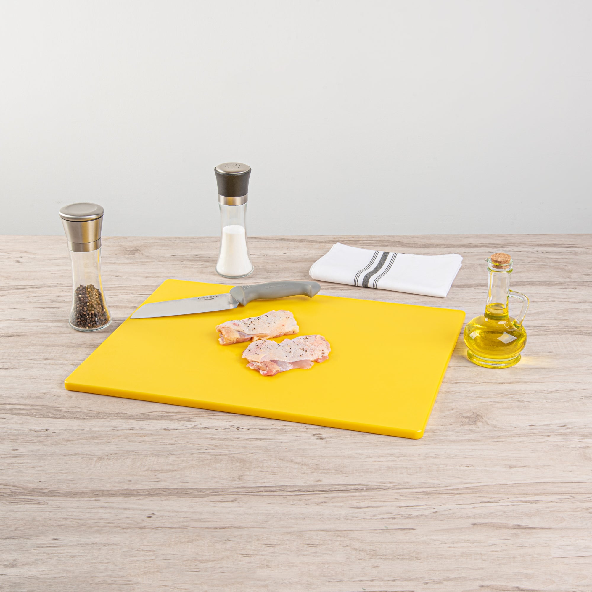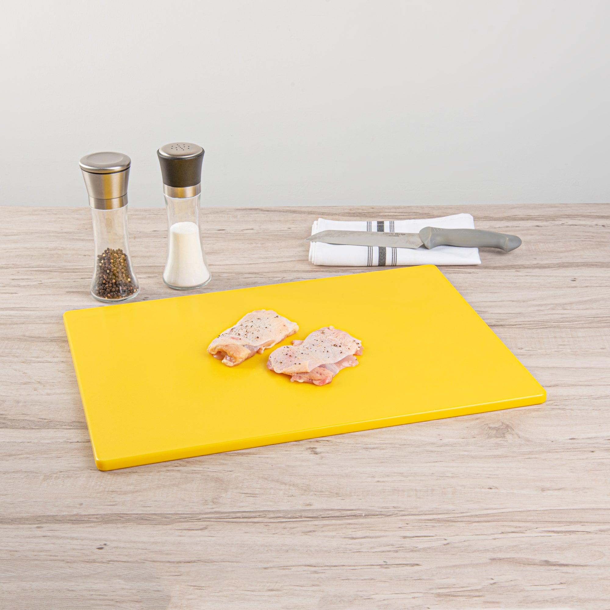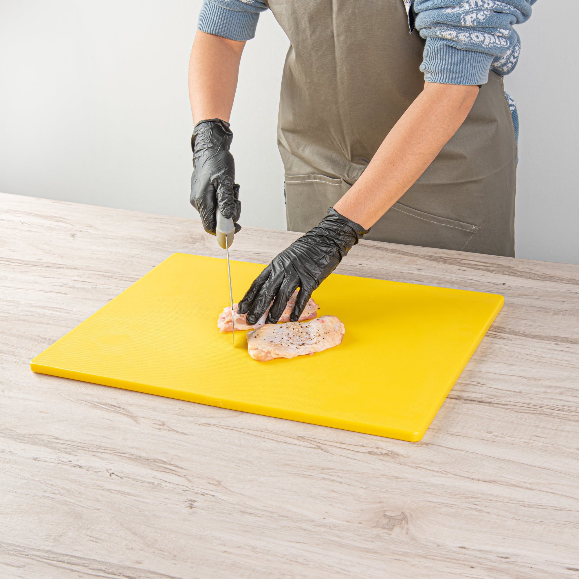 These color-coded cutting boards establish a system of assigning red to raw meats, green to fruits and vegetables, and yellow to poultry significantly increases cleanliness and enables the kitchen staff to quickly identify and use the correct board for each food type. These cutting boards come in different colors to comply with the HACCP standards.