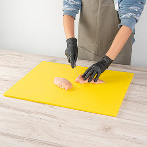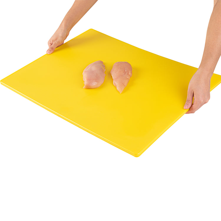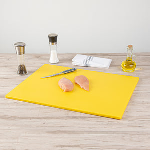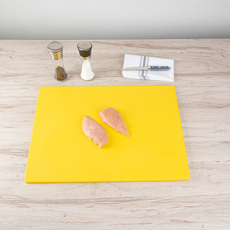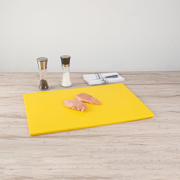 These color-coded cutting boards establish a system of assigning red to raw meats, green to fruits and vegetables, and yellow to poultry significantly increases cleanliness and enables the kitchen staff to quickly identify and use the correct board for each food type. These cutting boards come in different colors to comply with the HACCP standards.
