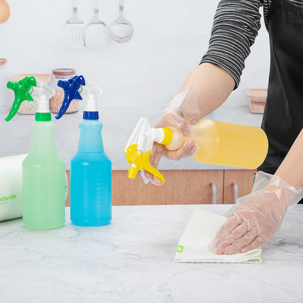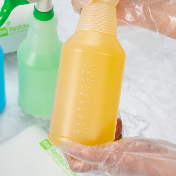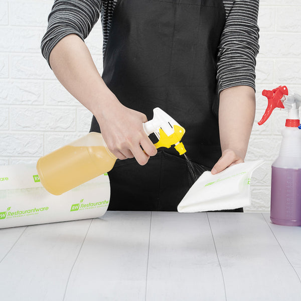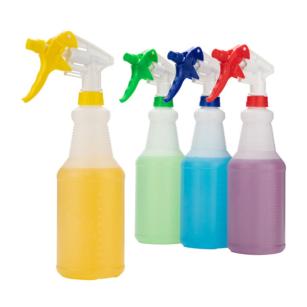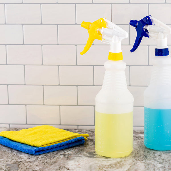 Easily dispense your liquid cleaning products with our RW Clean 25-ounce Yellow Plastic Spray Bottles. These empty plastic spray bottles have a comfortable ergonomic handle with a smooth trigger to reduce stress on your hand. Unlike stamped graduations, the molded graduations and measurement markers on these spray bottles won't fade and precisely indicate the amount of liquids available for long-lasting use. The high-quality trigger on these empty cleaning spray bottles twists on and off for tight and secure closure. As a bonus, the leak-free trigger on these spray bottles also features an adjustable nozzle with mist and stream settings for efficient cleaning. These reusable spray bottles are perfect for water, commercial cleaning liquids, or your homemade cleaning liquids. Ideal for storing all types of cleaning solutions, these label-free spray bottles are perfect for your commercial or industrial establishment. The vibrant yellow accents on these liquid spray bottles suit any color-coded storing system and match a variety of settings. These yellow liquid spray bottles contain up to 25 ounces and measure 11.5 inches in height and 3.1 inches in width. Sold in a 3 count box.