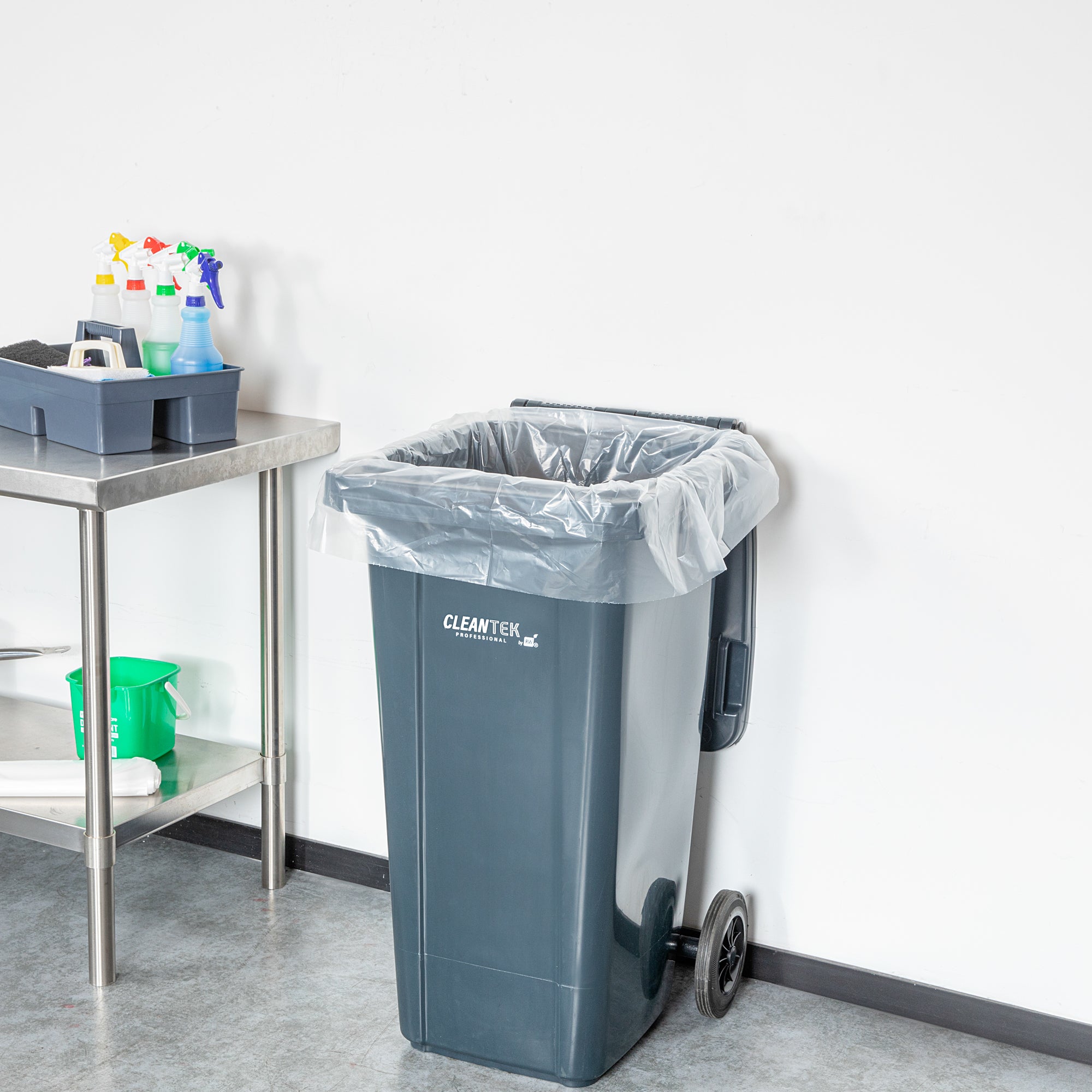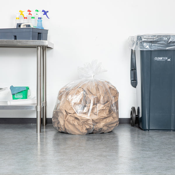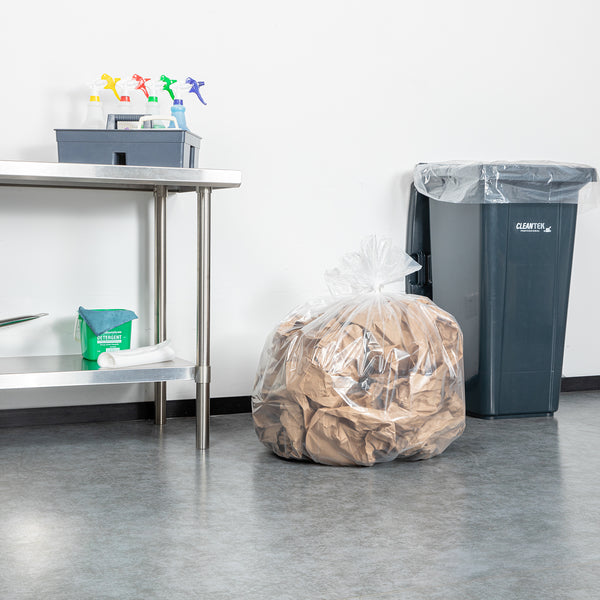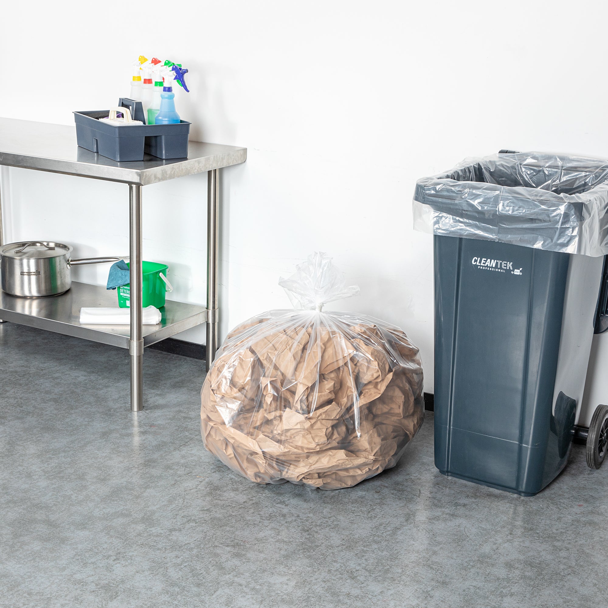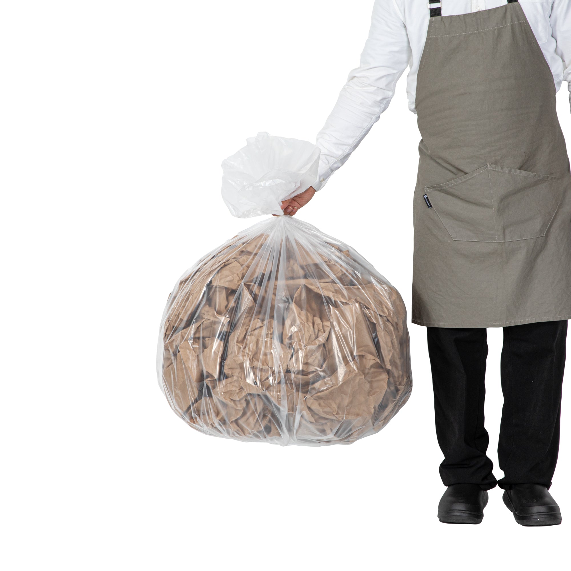 Prevent messy trash spills with leak-proof garbage bags. RW Clean Leak-Proof Clear Garbage Bags feature a star seal bottom that prevents leaks, making them ideal for managing wet trash in busy kitchens. Made from heavy-duty plastic, these plastic waste bags ensure even weight distribution, simplifying the removal process from bins and saving valuable time for staff. Measuring 40 inches in length and 46 inches in width, these clear garbage bags fit most commercial bins, providing a practical and efficient waste management solution. Optimize your waste disposal system with these durable garbage bags and enhance operational efficiency. Each order includes 100 RW Clean Leak-Proof Clear Garbage Bags.