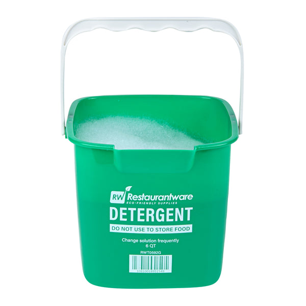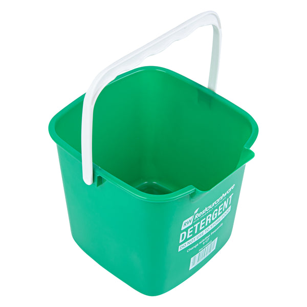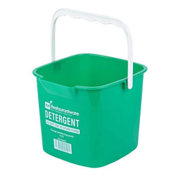 Enhance your back-of-house efficiency with our RW Clean 6-quart Square Green Plastic Cleaning Bucket. Made from HDPE plastic, this bucket is designed to handle tough cleaning demands in commercial settings. The square design provides efficient storage and stackability, saving space in crowded janitorial closets. Its bold green color allows for quick identification, helping to minimize the risk of cross-contamination. Featuring an ergonomic plastic handle, this cleaning bucket offers a secure grip for easy transport. A built-in spout ensures controlled pouring, reducing mess during disposal. Interior graduations in quarts and liters help ensure precise measurement for larger volume solutions. Clearly labeled with “DETERGENT” and safety instructions, it helps staff follow proper procedures with ease. With a spacious 6-quart capacity, this bucket is ideal for handling larger cleaning tasks. Measuring 8.5 inches in length by 8.5 inches in width by 7.25 inches in height. Sold in a 1 count box.
