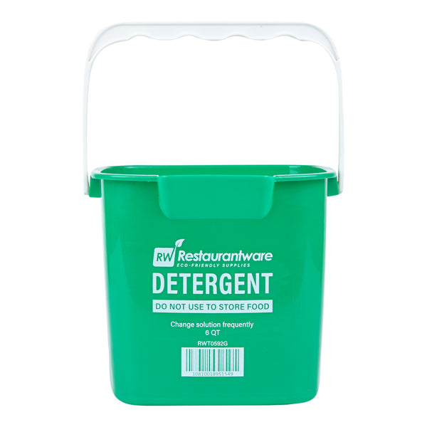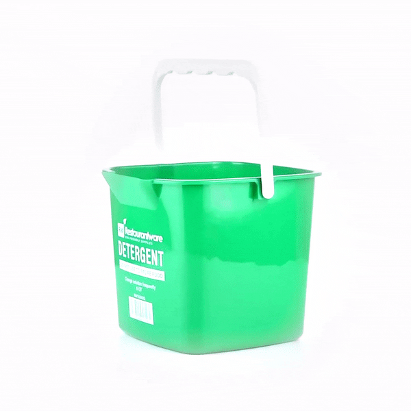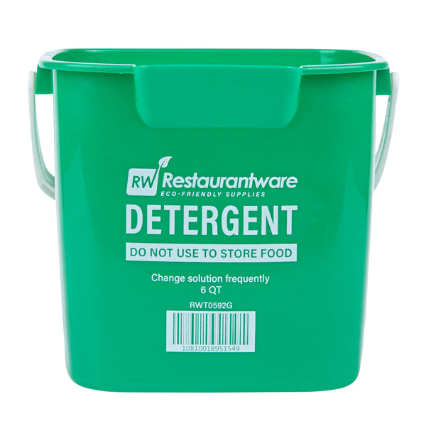 Enhance your back-of-house efficiency with our RW Clean 6-quart Square Green Plastic Cleaning Buckets. Made from HDPE plastic, these buckets are designed to handle tough cleaning demands in commercial settings. The square design provides efficient storage and stackability, saving space in crowded janitorial closets. Their bold green color allows for quick identification, helping to minimize the risk of cross-contamination. Featuring an ergonomic plastic handle, each cleaning bucket offers a secure grip for easy transport. A built-in spout ensures controlled pouring, reducing mess during disposal. Interior graduations in quarts and liters help ensure precise measurement for larger volume solutions in each bucket. Clearly labeled with “DETERGENT” and safety instructions, they help staff follow proper procedures with ease. With a spacious 6-quart capacity, these buckets are ideal for handling larger cleaning tasks. Measuring 8.5 inches in length by 8.5 inches in width by 7.25 inches in height. Sold in a 10 count box.