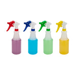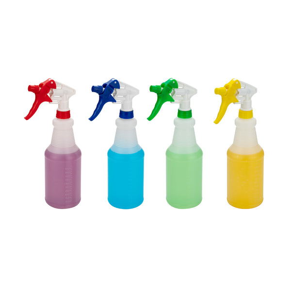 Keep your business spotless with our RW Clean Assorted 25 oz Plastic Spray Bottle Set. This empty spray bottle set has an adjustable nozzle with mist and stream settings for efficient cleaning at your foodservice establishment. Each order includes 1 yellow, 1 blue, 1 red, and 1 green plastic spray bottle, allowing you to stay organized and easily identify the liquids in each bottle. The molded graduations and measurement markers on this cleaning spray bottle set won't fade after multiple uses and allows you to measure cleaning solutions with ease. With an ergonomic trigger, this cleaning spray bottle set provides you with a comfortable way to spray equipment or surfaces while eliminating hand fatigue. This cleaning bottle set features a label-free design, allowing you to conveniently pair bottles with any cleaning solution. Each spray bottle contains up to 25 ounces and measures 3.1 inches in diameter by 11.6 inches in height. You will receive 4 plastic cleaning bottles per order.