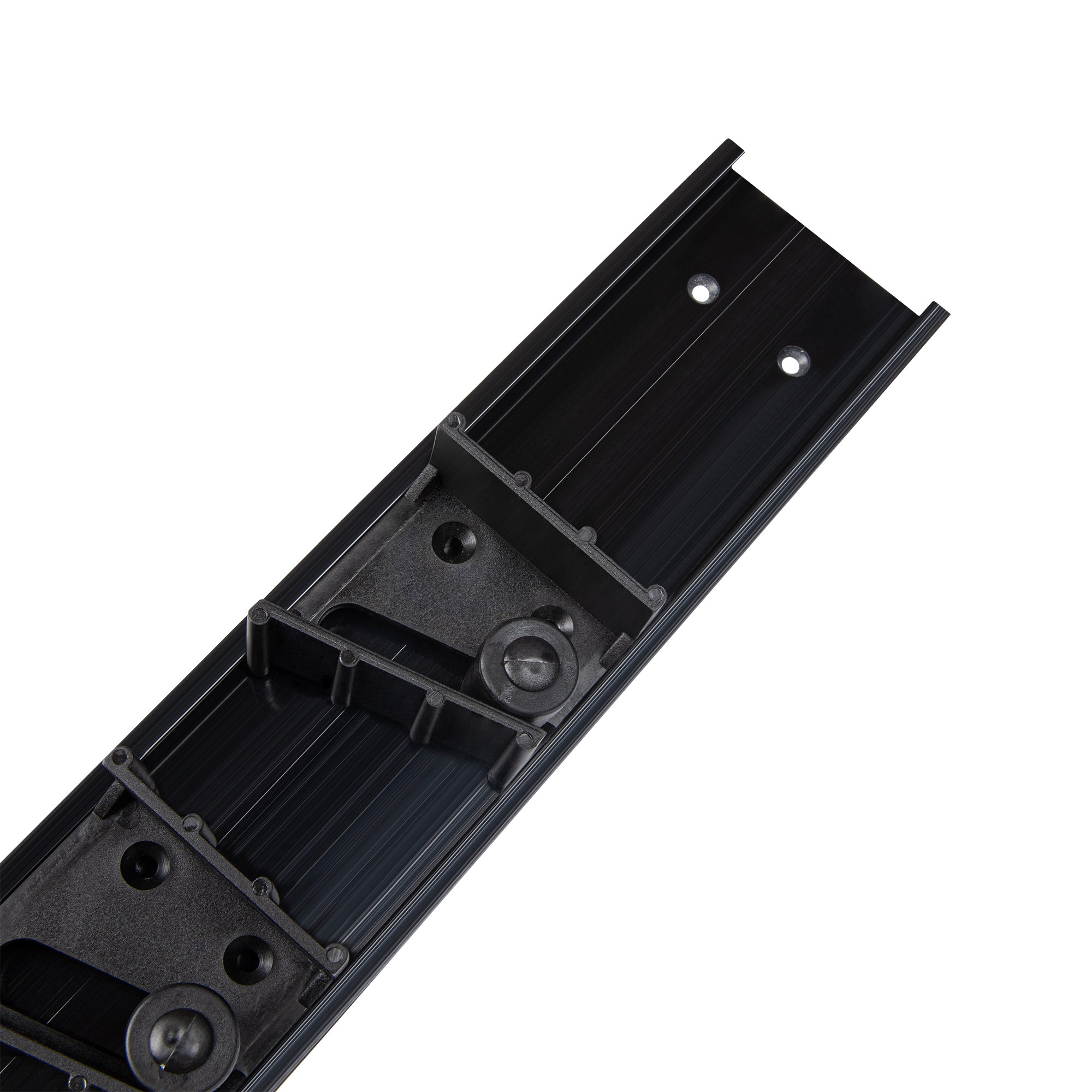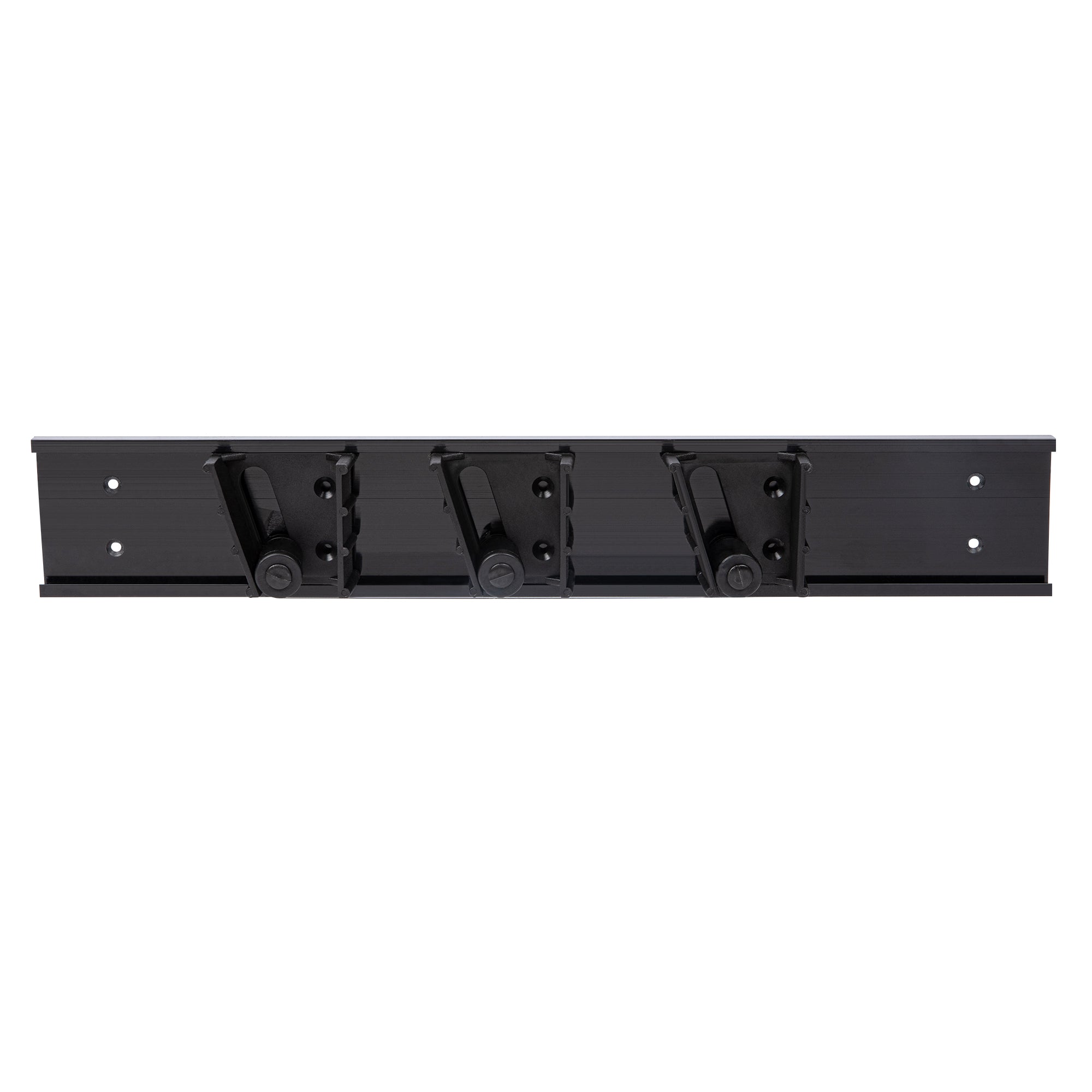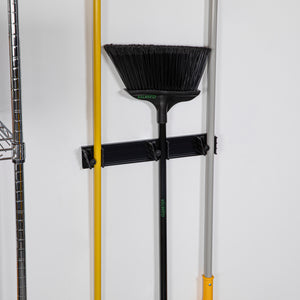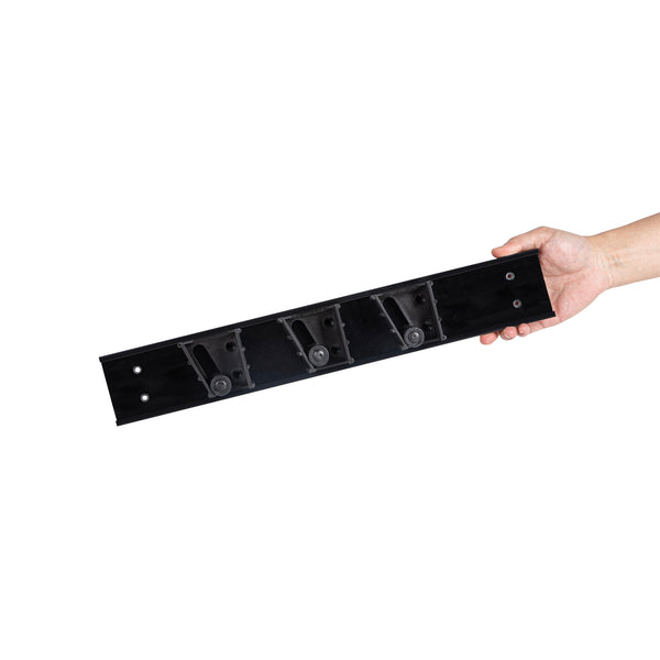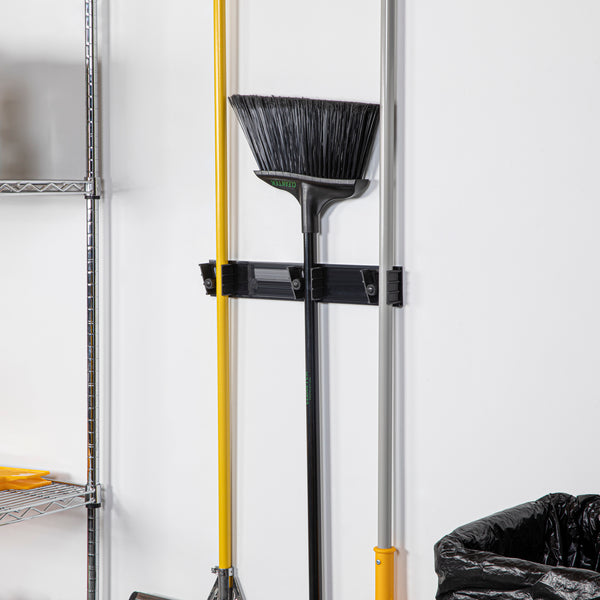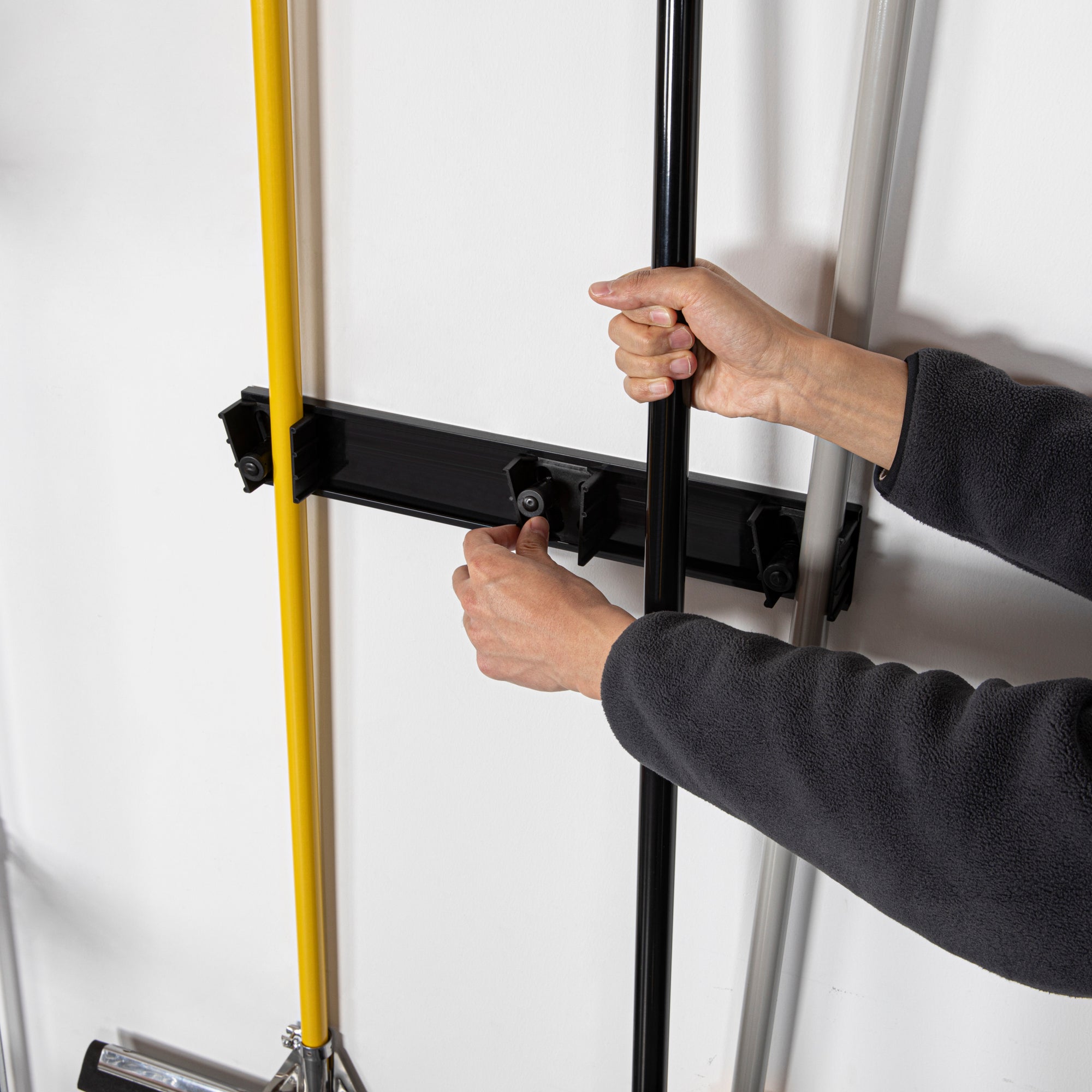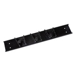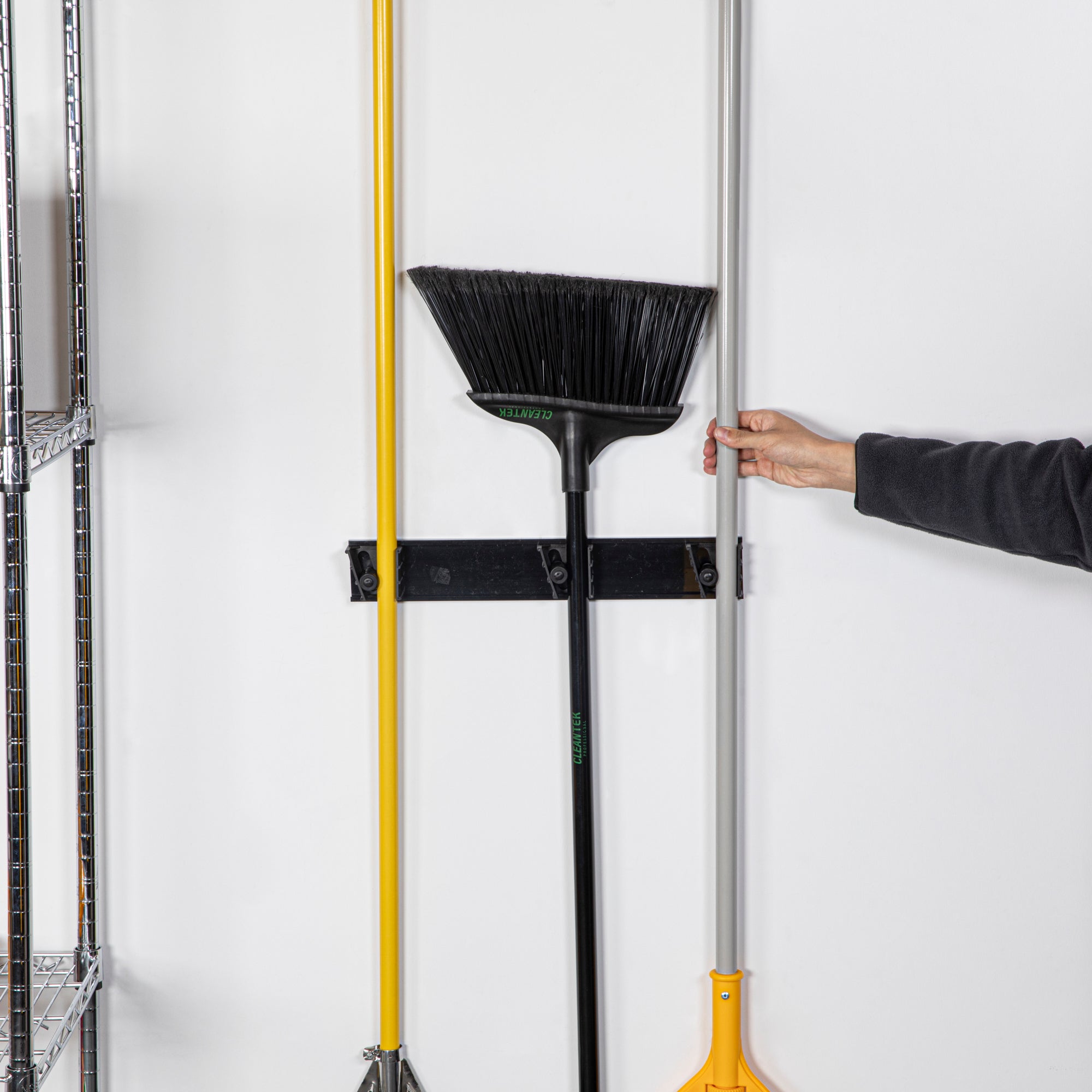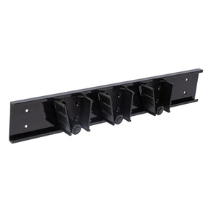 Easily hang a variety of tools all in the same place with our RW Clean Black Plastic Hang Up Tool Holder. Featuring 3 customizable slots, this versatile mop and broom holder has an adjustable design that allows you to smoothly slide the rubber slots around to perfectly hang a variety of tools. This commercial tool holder has a snap-in structure that easily holds your tools and securely keeps them in place. Once needed, it easily releases your tools for accessible use. With a space-saving design, this hanging tool holder offers a convenient way to maintain a neat and organized supply closet. This handy tool rack includes 4 strong screws to provide a quick and easy set up at your hotel, bar, restaurant, or other foodservice establishment. Measuring 17.75 inches long by 2.75 inches wide, this tool holder is available in a 1 count box.