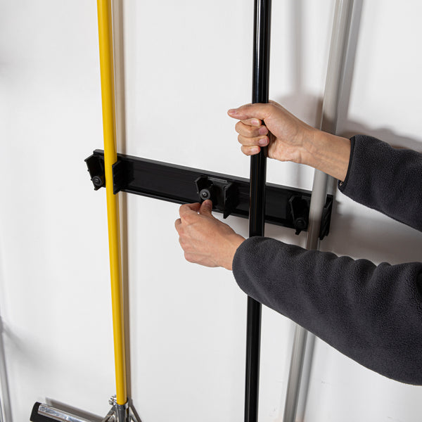 - Wall mount prevents damage to bristles, mop heads, and handles