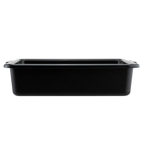 Quickly clean up dirty tables or workspaces with this RW Clean Black Plastic Bus Tub. Featuring sturdy and easy-to-grip handles, this premium plastic bus tub creates an easy way for staff to transport dirty dishes, glassware, silverware, and cookware. The rectangular shape provides plenty of room to stack multiple piles of dishes, while the durable plastic construction expertly resists cracking or breaking under the weight of heavy dinnerware. Featuring a black finish and a low-profile design, this heavy duty bus tub is great for discreetly clearing and bussing tables in restaurants, cafeterias, and other foodservice establishments. Each of these commercial-use restaurant bus tubs measures 21.25 inches in length by 15.75 inches in width and has a total depth of 4.75 inches. The inside of these bus tubs measures 18.5 inches long by 14.6 inches wide. Pair this bus tub with its coordinating lid (SKU: RWT0472-12) to complete your cleanup! Sold in a 12 count box. Lids sold separately.