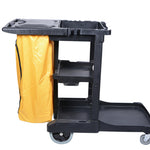 Efficiently speed up your cleanup using this RW Clean Black Plastic Heavy-Duty Janitor Cart. Equipped with 3 sturdy shelves, this janitorial cleaning cart makes it easy to organize and transport your cleaning supplies in large restaurants, hotels, schools, and other commercial establishments. This heavy-duty service cart is manufactured from premium plastic and can support up to 175 pounds of your cleaning tools and supplies. Featuring built-in broom handle holders and a convenient hook for hanging spray bottles or wet floor signs, this custodial cart has all of the features you need to maximize the efficiency of your cleaning or janitorial staff. The included 20-gallon removable nylon bag can be used to quickly collect waste or laundry throughout your cleanup, while the bag's waterproof and durable nature ensures you won't have to deal with any annoying leaks or messes. To ensure a sanitary and discreet cleanup, this janitorial cart has a hinged lid that covers the nylon bag to keep trash and dirty laundry hidden and out of sight. Designed with smooth-rolling wheels and casters, this janitor cart makes it simple to transport cleaning supplies in large buildings and navigate around guests in busy areas. Sold in a 1 count box.