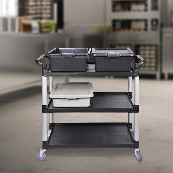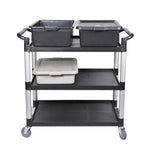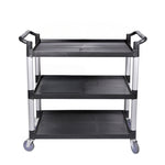 Easily organize your products with our RW Clean Black Plastic Large Heavy-Duty Rolling Utility Cart. Equipped with 3 sturdy shelves, this versatile metal rolling cart provides plenty of space to transfer dirty dishes from your restaurant's dining area or store cleaning products in your hotel's supply closet. This 3-tier utility cart is designed to support up to 220 pounds of products. Featuring easy-to-grip handles and swivel wheels, this 3-tier rolling utility cart allows you to easily maneuver it around tight spaces at your hotel, cafeteria, restaurant, and other foodservice establishments. Complete this heavy-duty utility cart with our attachable bus tub and slim trash can (SKU: RWT0464 & RWT0465) to organize all of your janitorial supplies. Measuring 40.25 inches long by 19.75 inches wide by 37.75 inches tall, this rolling utility cart is perfect for all foodservice establishments. Sold in a 1 count box.